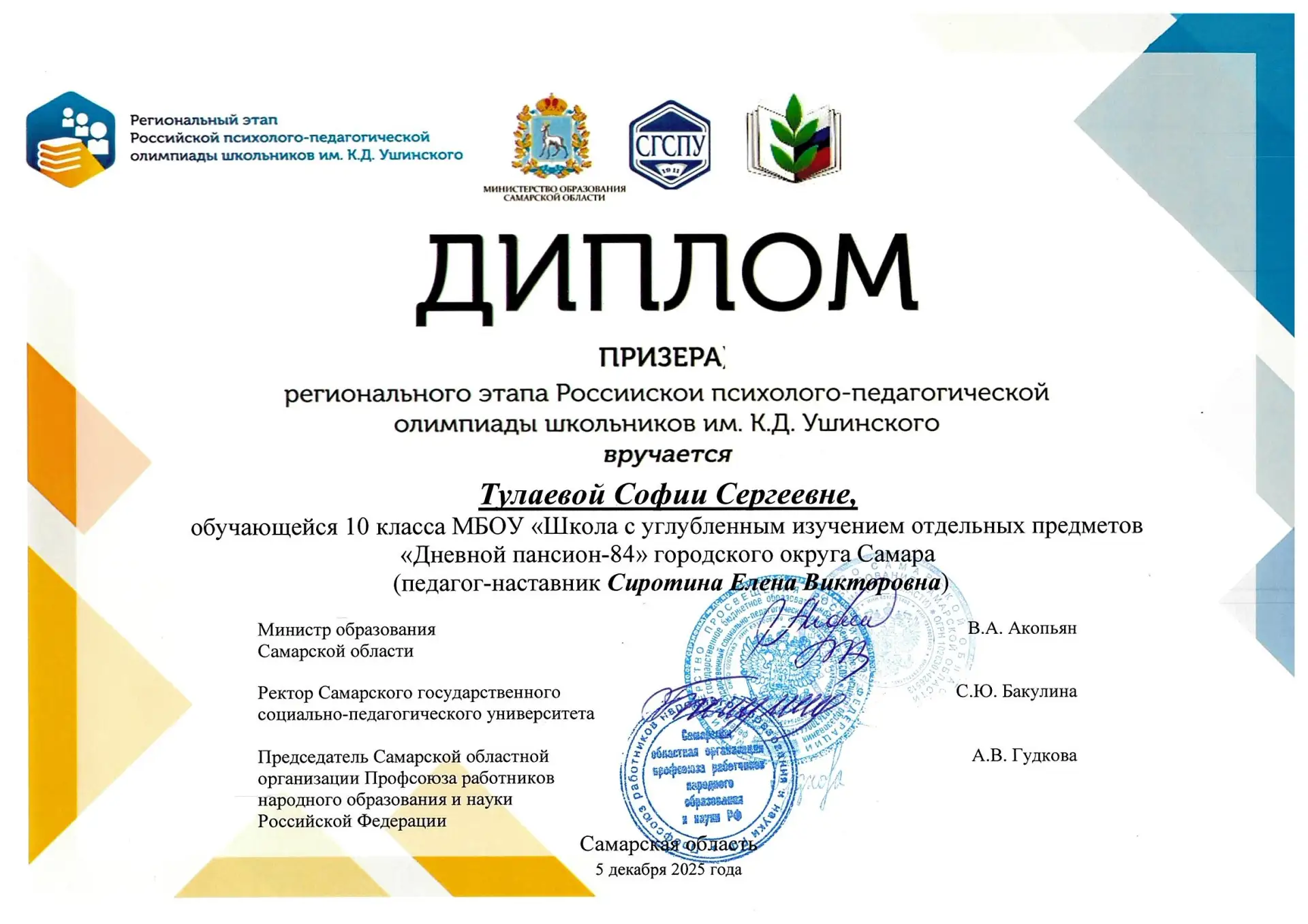 Поздравляем ученицу 10А класса Тулаеву Софию — призера регионального этапа Российской психолого-педагогической олимпиады! 📚💐