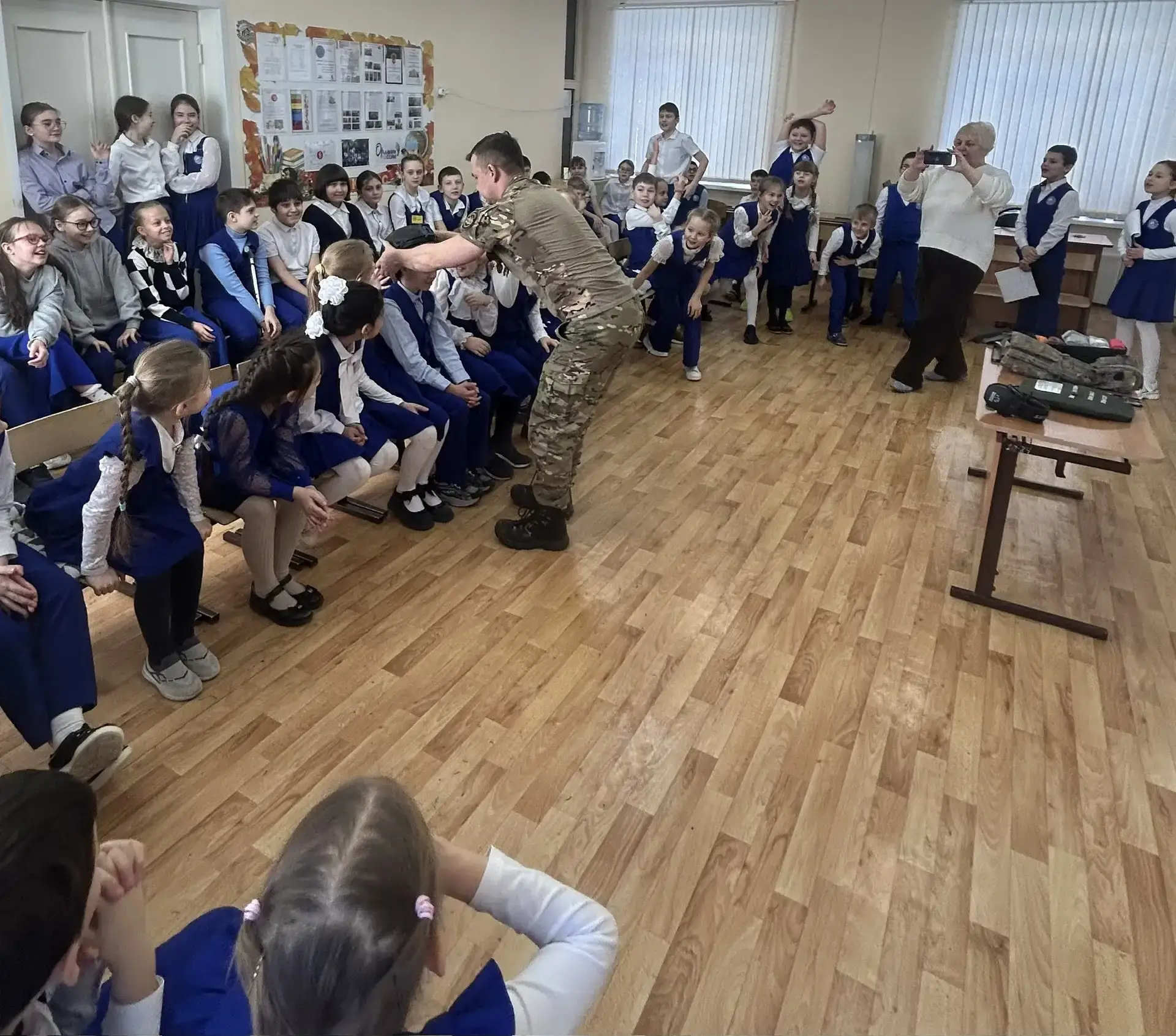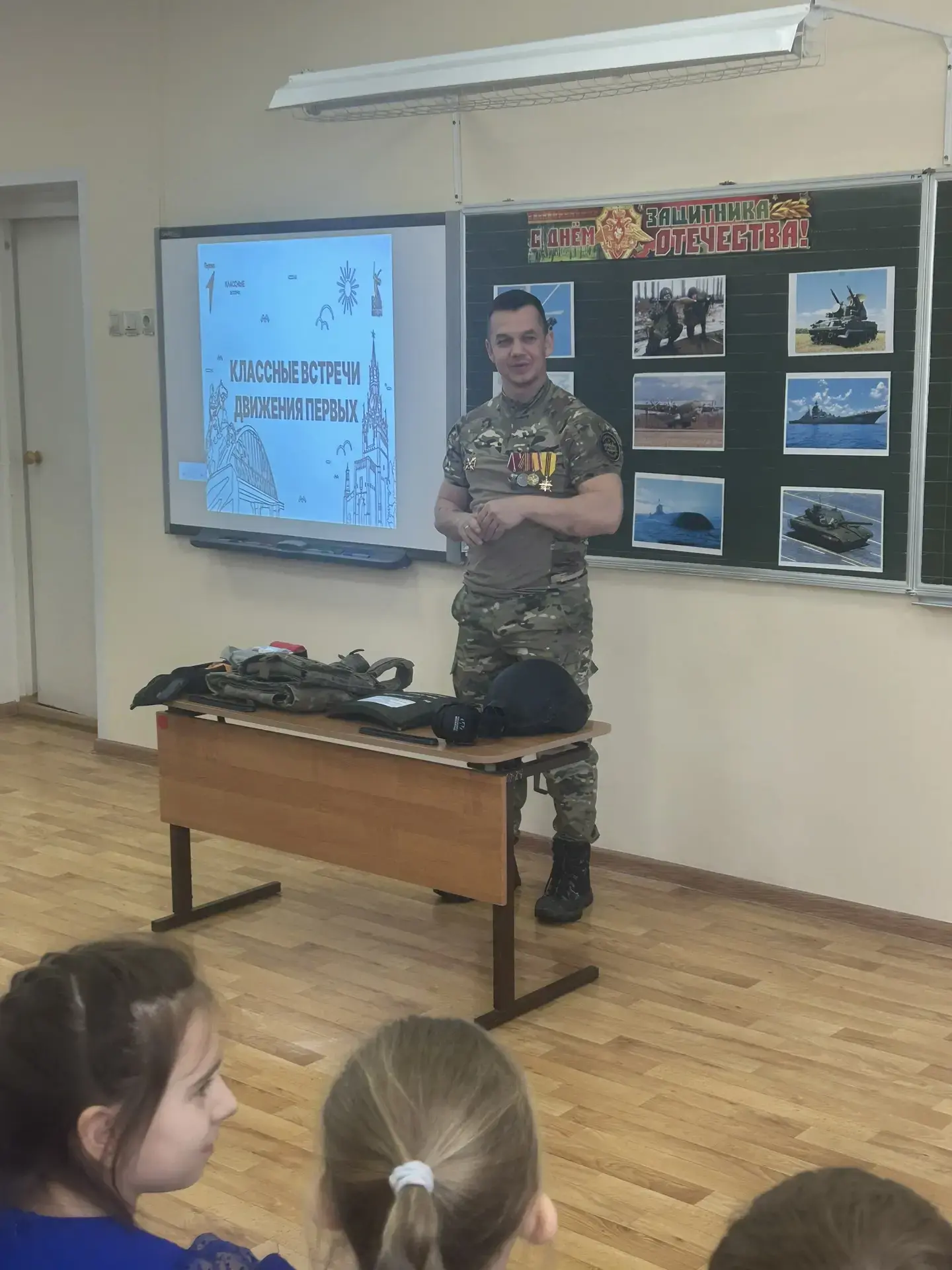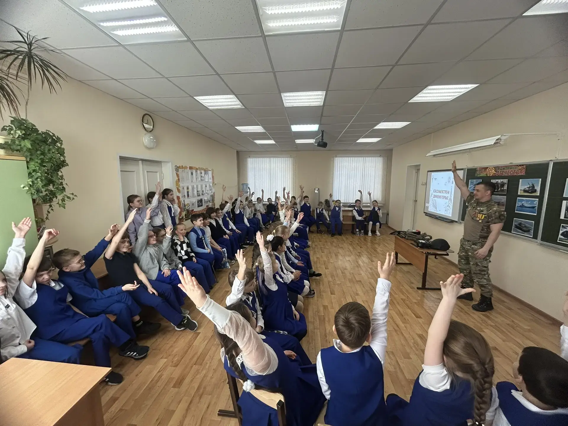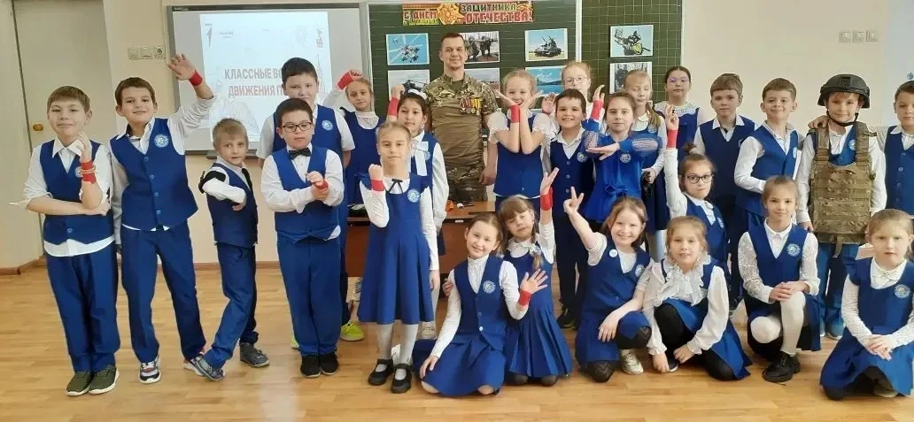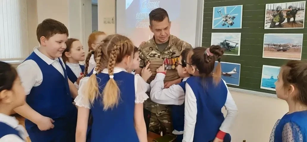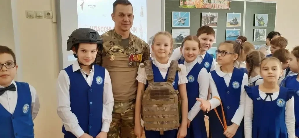 18 февраля 2026г. для учеников 2Б и 4В классов состоялась «Классная встреча» с участником СВО Веткиным Павлом Юрьевичем. Ребята подготовили для гостя концерт со стихами и песнями 🎤🎶, а после засыпали вопросами. Самым важным открытием стало то, что письма и посылки действительно доходят! Павел Юрьевич рассказал, что бойцы берегут детские весточки и даже украшают ими стены блиндажей. 📩📦