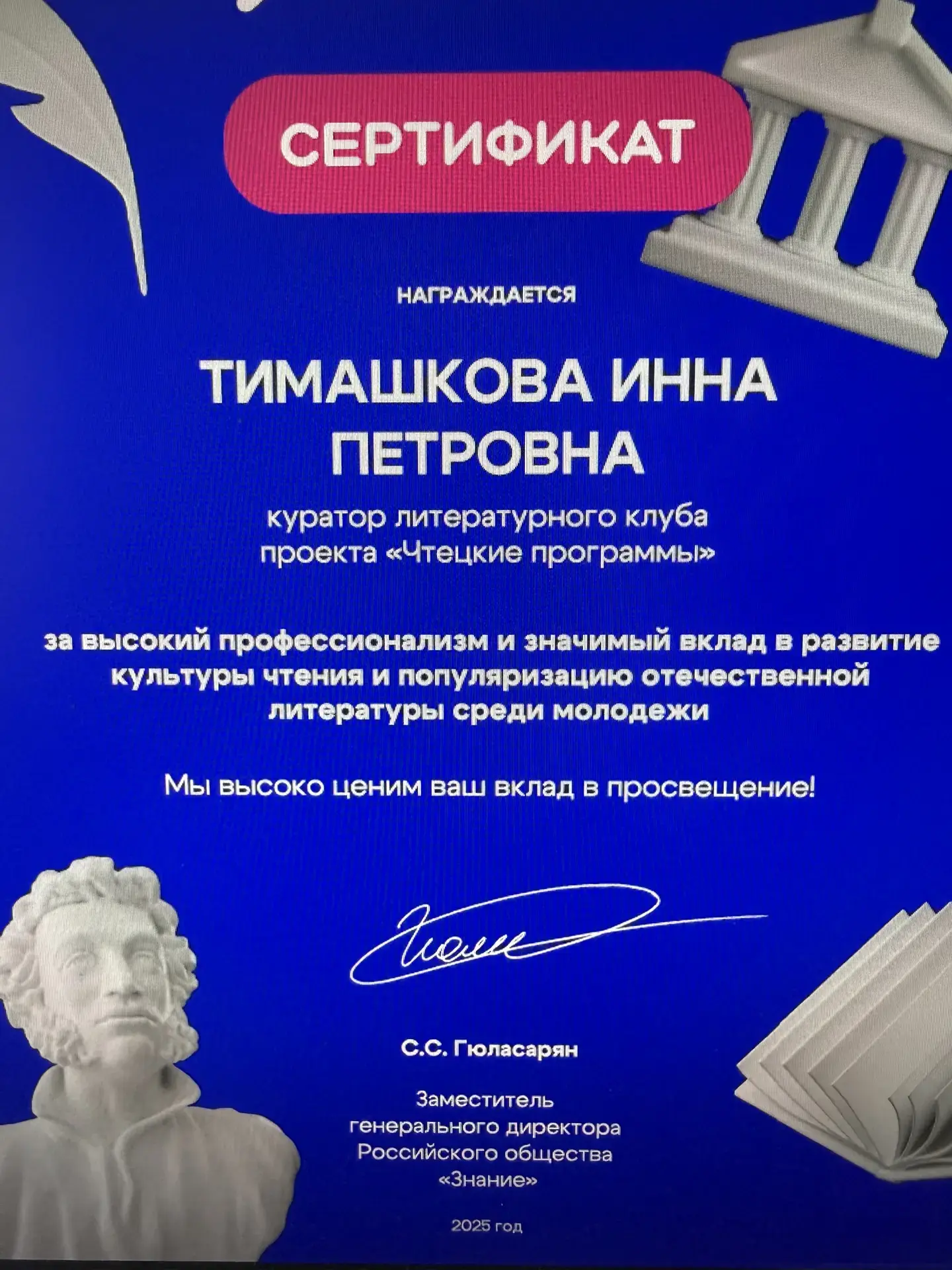 🏆 Куратор клуба, Инна Петровна Тимашкова, отмечена сертификатом Российского общества «Знание»! Её высокий профессионализм и вклад в популяризацию отечественной литературы среди молодежи получили заслуженную оценку. Гордимся тем, как 10А развивает культуру чтения в нашей школе! Так держать! 👏