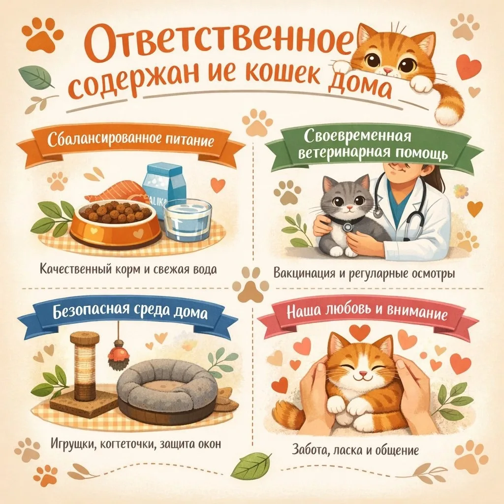 🐾 Забота о кошке — это не только ласка, но и ежедневные обязанности: качественное питание, ветеринарное наблюдение, безопасность дома и, конечно, искреннее внимание. Ответственное отношение — это глубокое понимание, что живое существо — не игрушка и не временная прихоть. Каждое решение, от выбора корма до решения о стерилизации, влияет на качество и продолжительность жизни питомца, а принятое однажды обязательство — на всю жизнь животного.