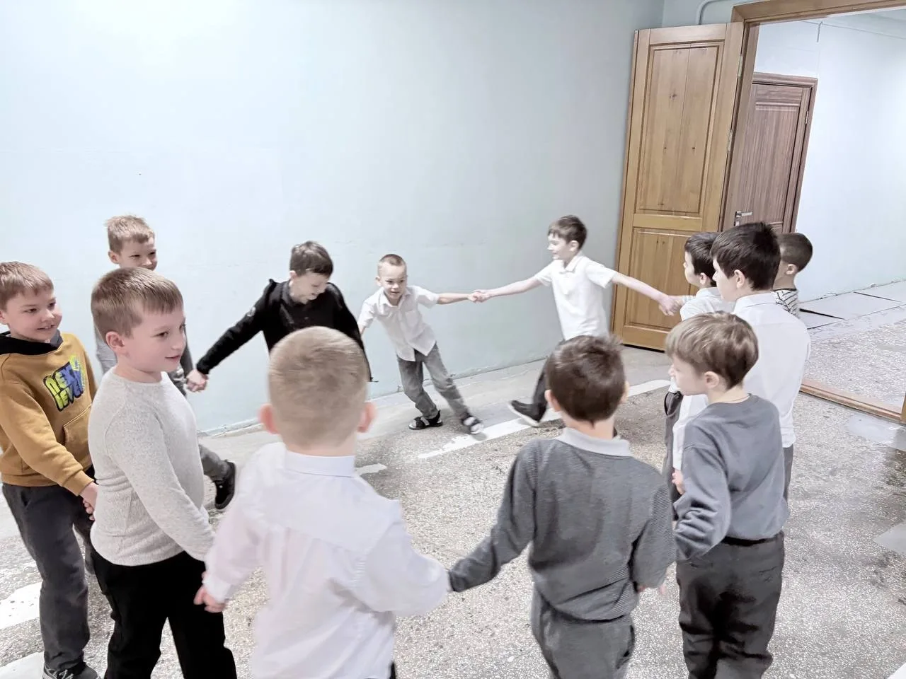 Рекреация у актового зала превратилась в "море" и "сушу". Дети встали в круг, взялись за руки и водили хоровод под музыку. Как только мелодия останавливалась — все замирали!