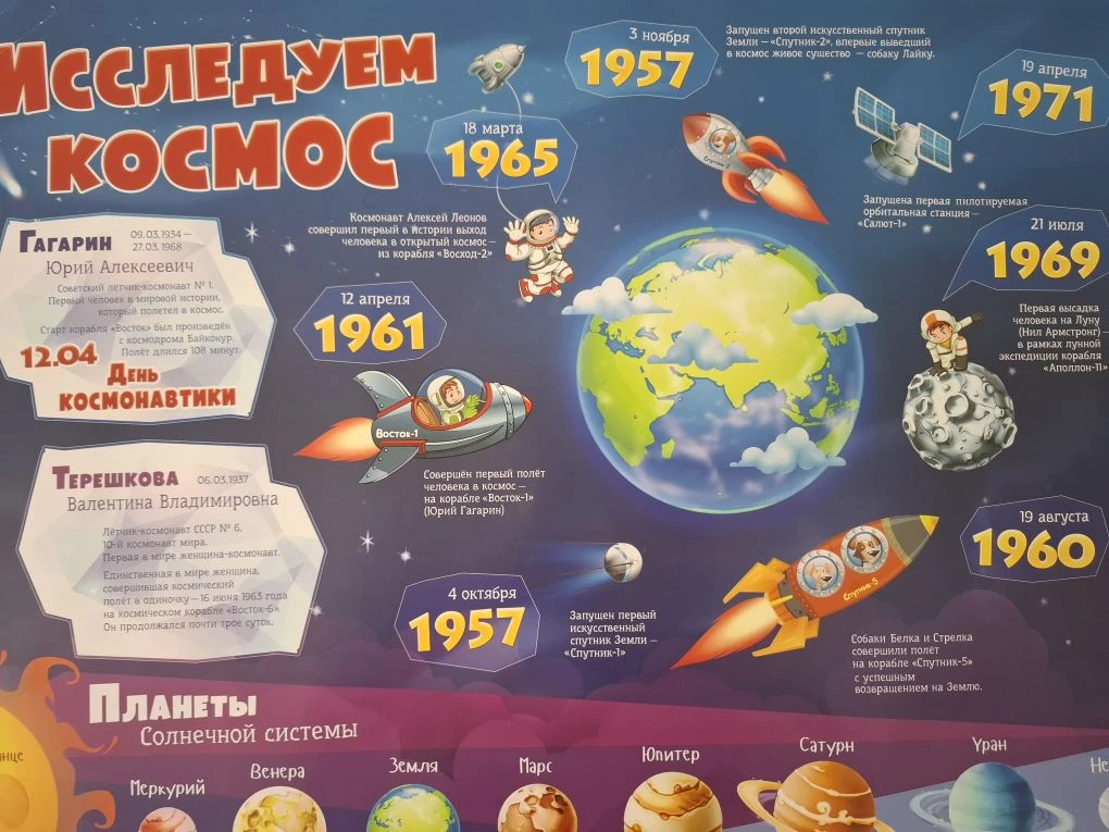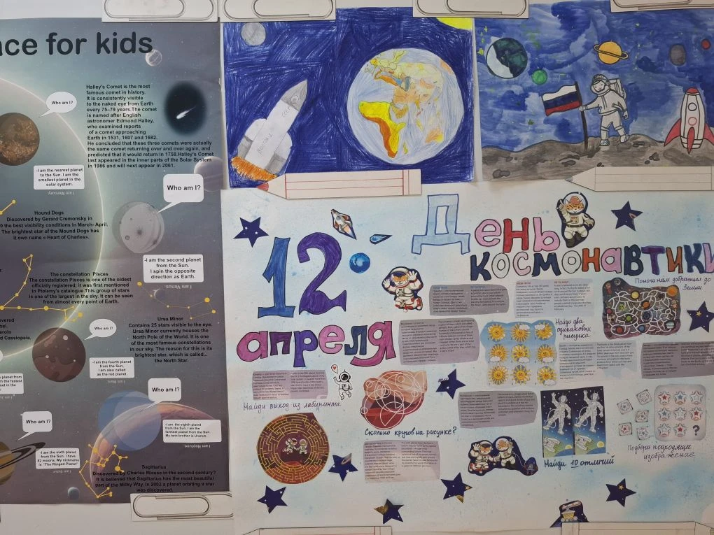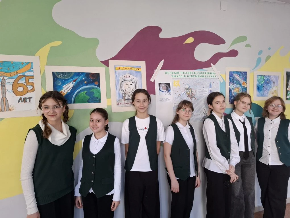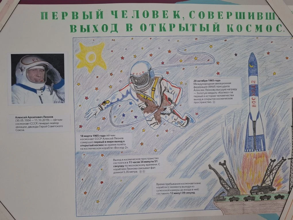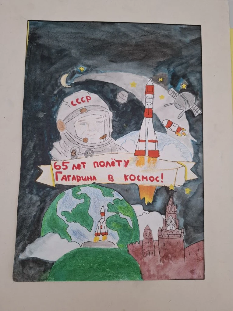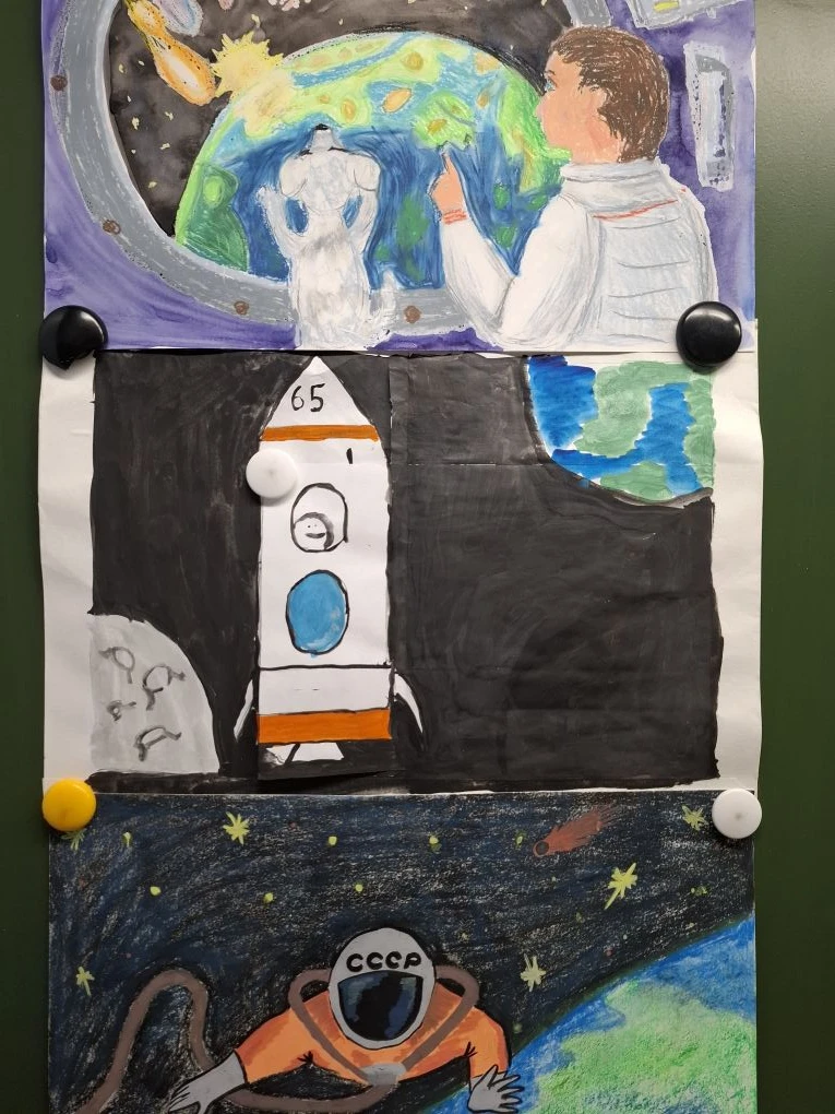 У нас открылась выставка рисунков 5–6 классов, посвящённая 65‑летию первого полёта в космос! 😍
