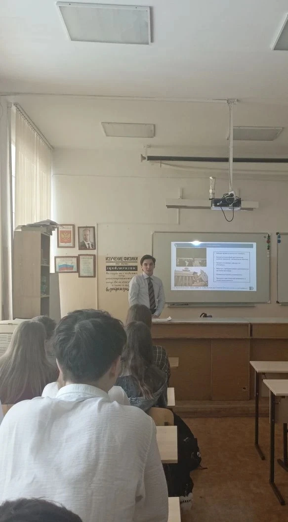 Сегодня в рамках предметной недели естественно-научного цикла перед учащимися 9,10 классов, углублённо изучающих физику, выступил выпускник нашей школы 2020 г. Матвеев Илья. В этом году он закончил Самарский университет, кафедра конструкции и проектирования двигателей летательных аппаратов, поступил в аспирантуру. Илья поделился опытом подготовки к ЕГЭ, обучения в ВУЗЕ и возможностями работы по своей специальности. Благодарим Илью и желаем ему дальнейших успехов!