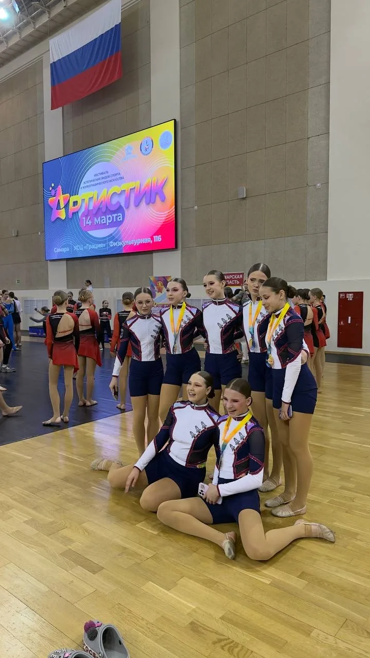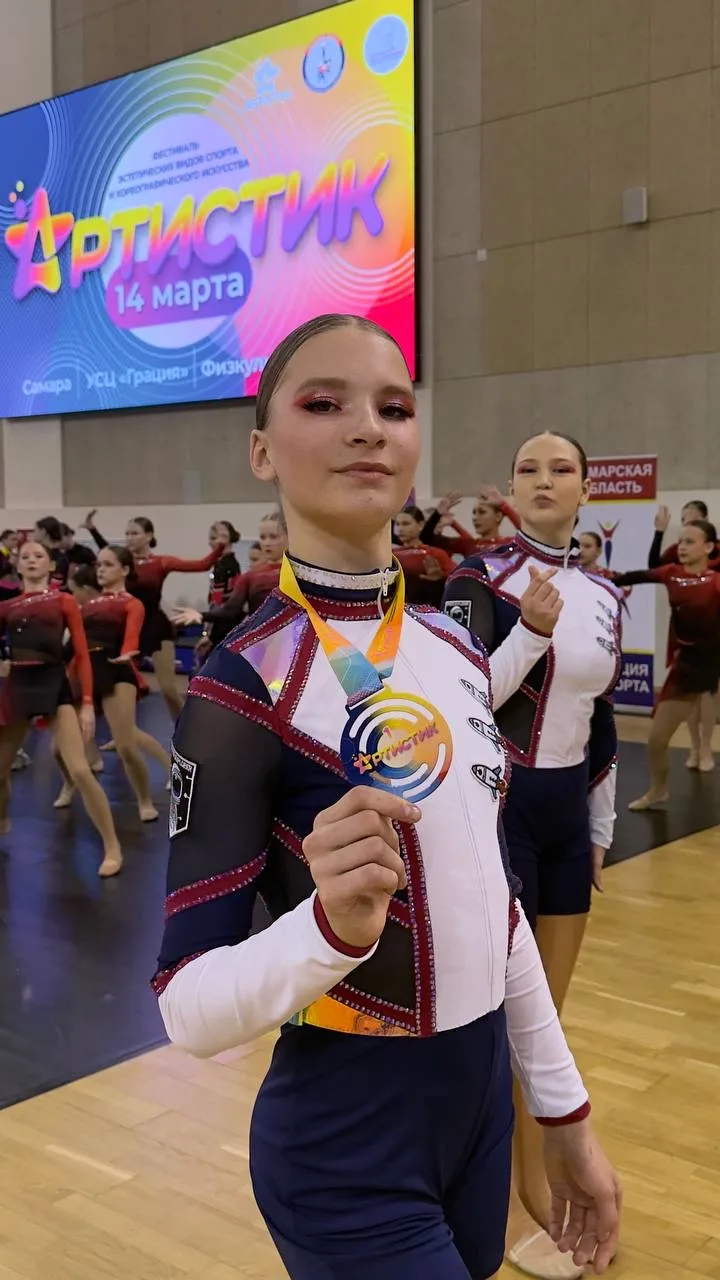 ✨ Золото «Артистика»! В УСЦ «Грация» (г. Самара) прошёл Фестиваль эстетических видов спорта и хореографического искусства «Артистик». Ученица 7 «Б» класса, Соколова Анастасия, в составе команды «Идеал» покорила жюри в категории «Чир-фристайл» (девушки 12–14 лет) и завоевала золотую медаль! Яркий номер, безупречная синхронность и невероятная энергетика принесли заслуженную награду.