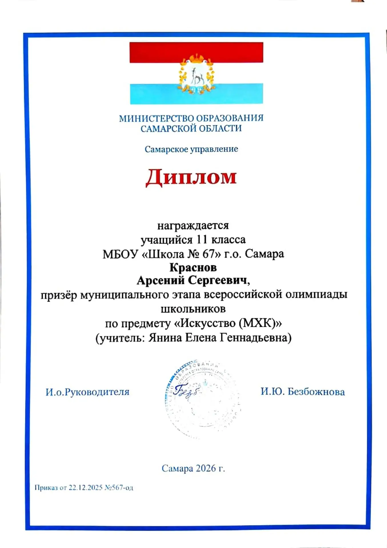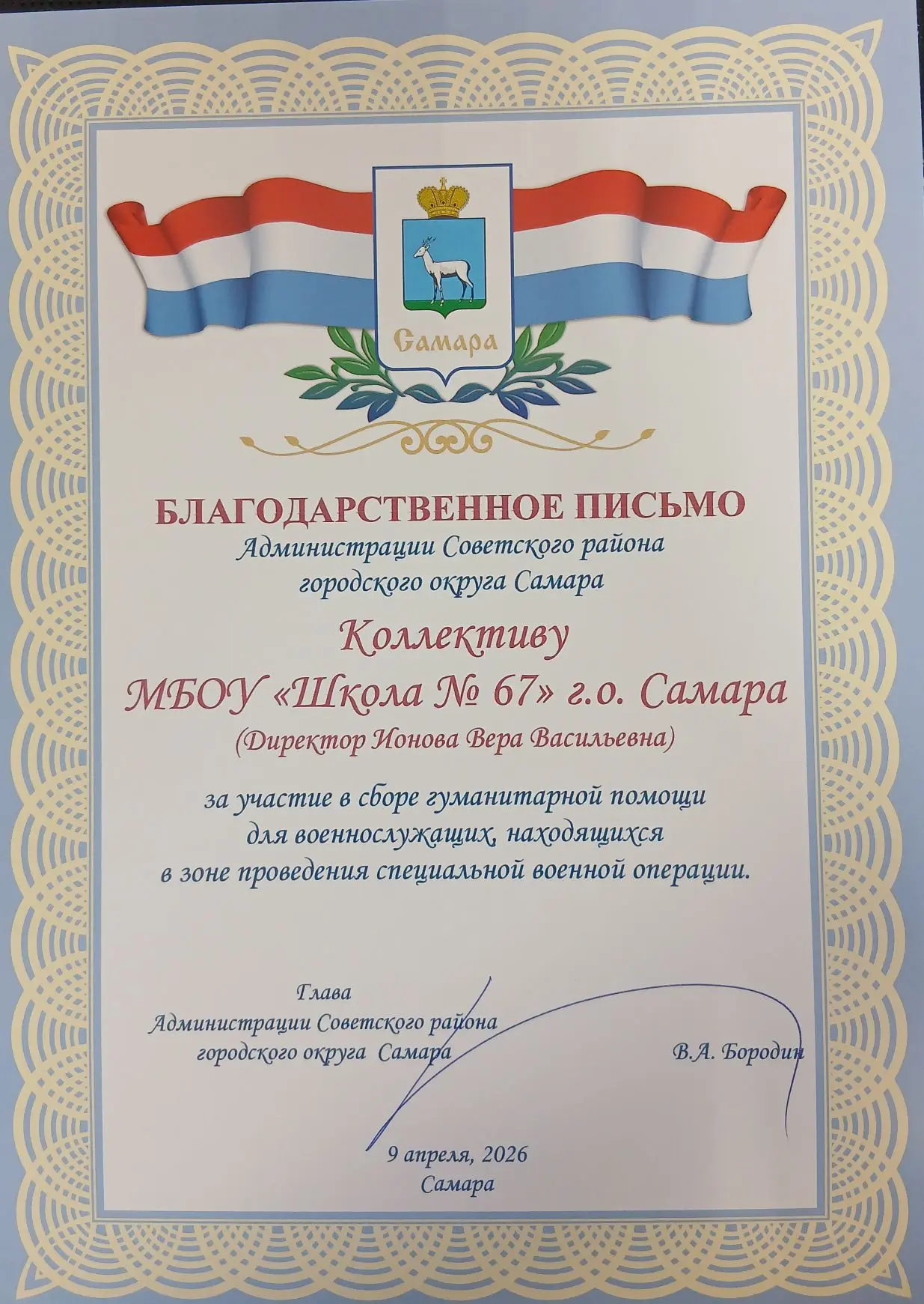 В рамках акции "С любовью и теплом от жителей Советского района" коллектив Школы 67 был награжден благодарственным письмом Администрации Советского района г.о. Самара за участие в сборе гуманитарной помощи для военнослужащих, находящихся в зоне проведения специальной военной операции.