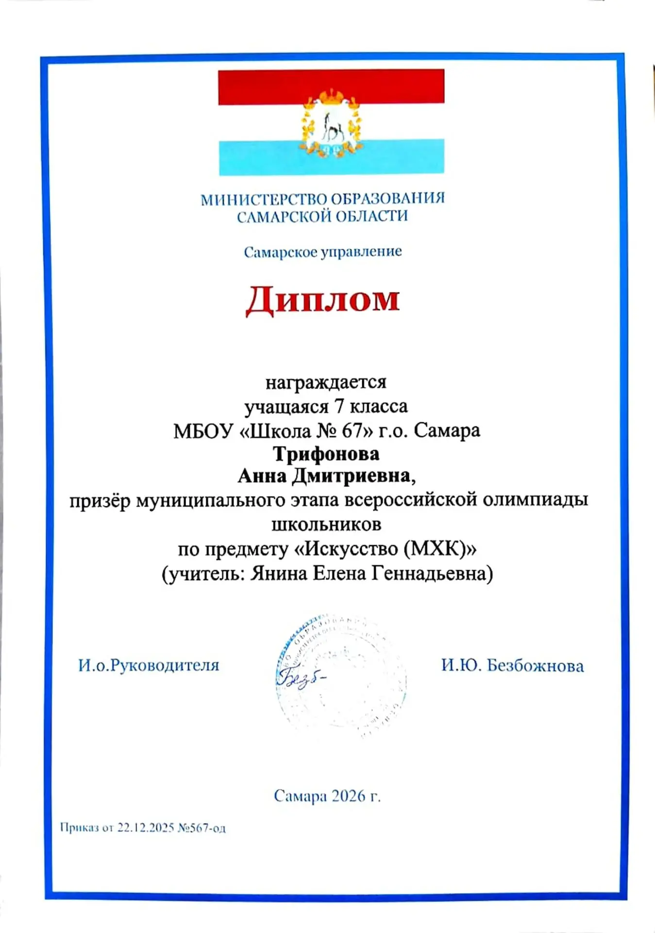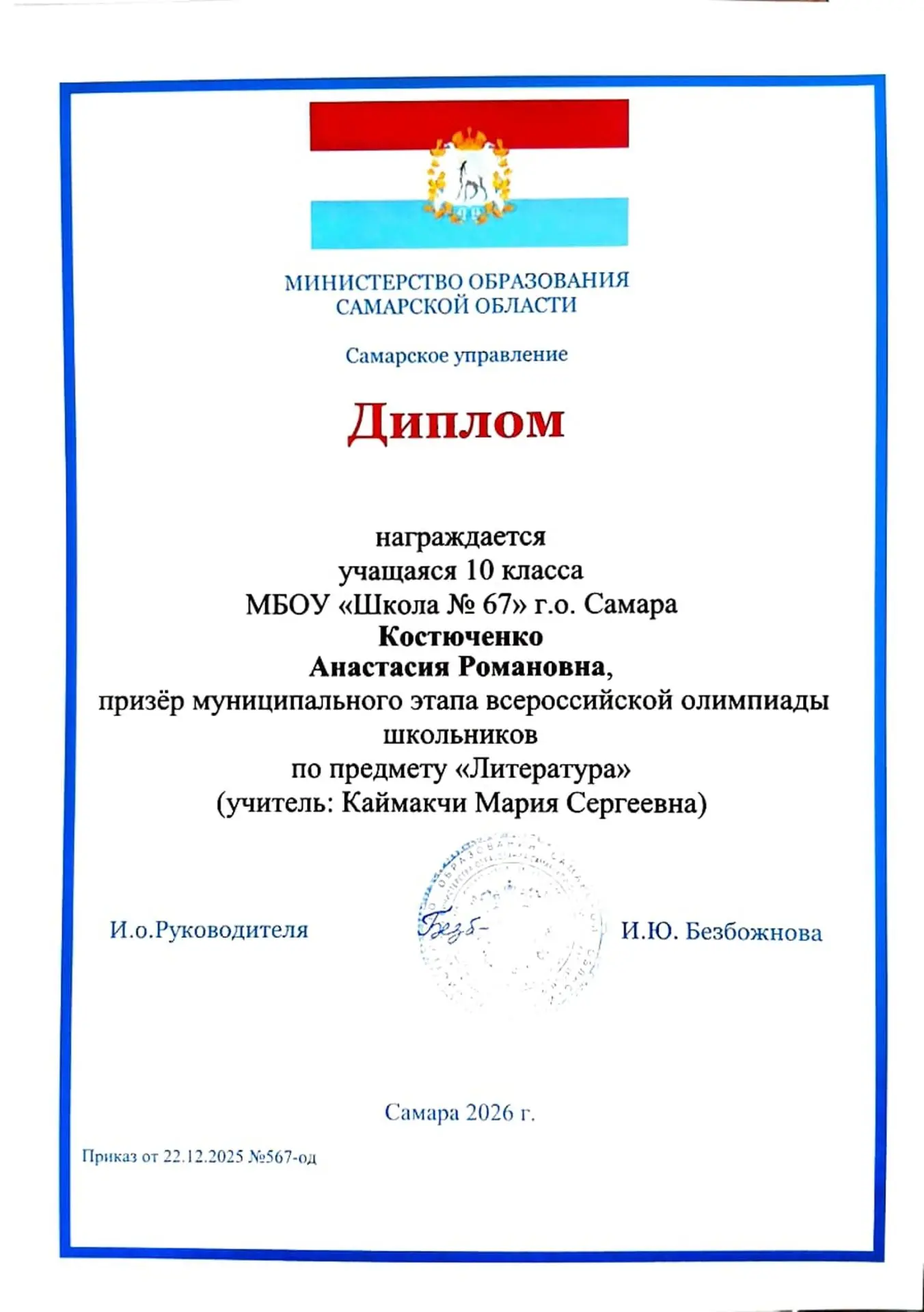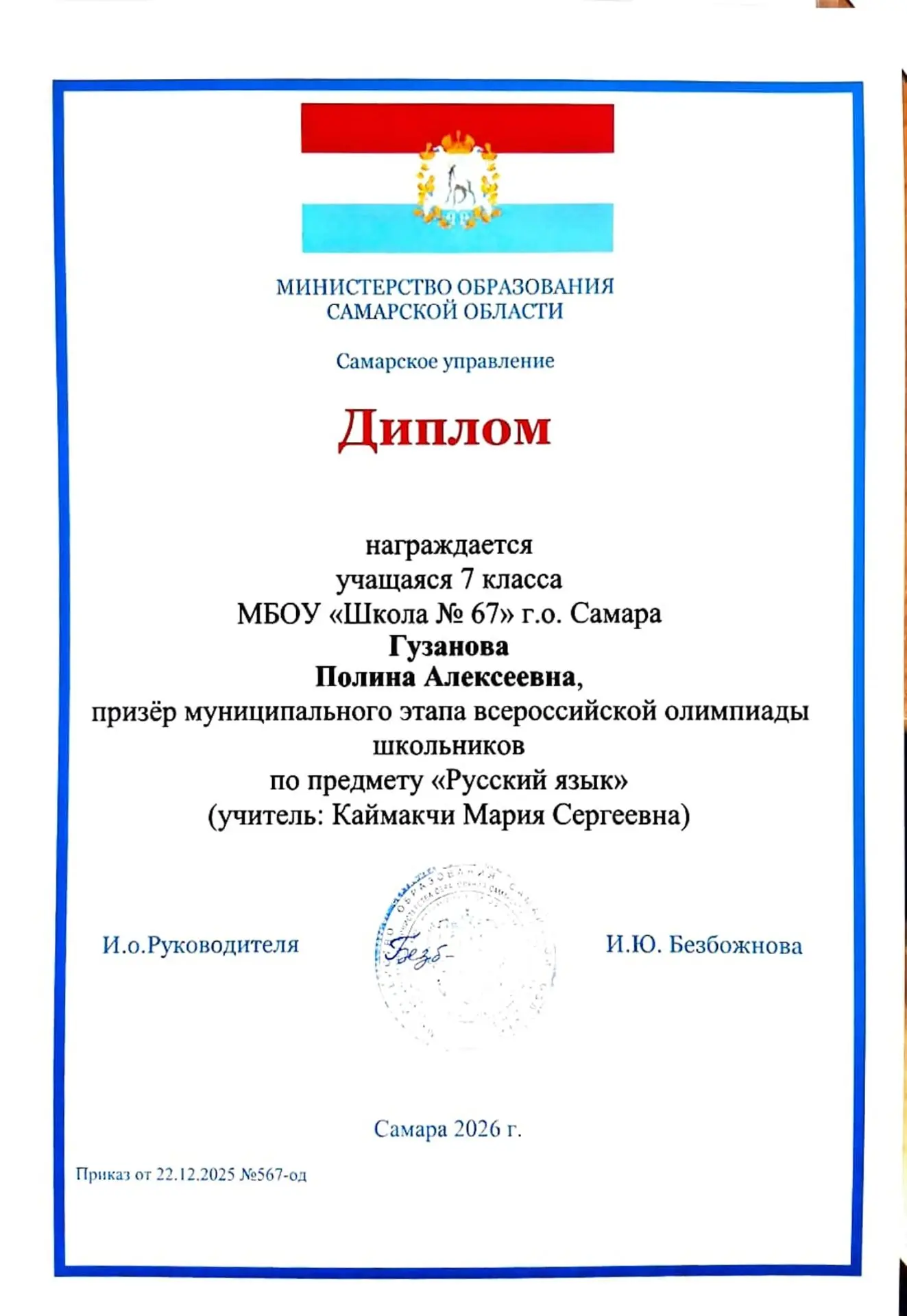 ✨ Гузанова Полина удостоена Диплома призёра муниципального этапа Всероссийской олимпиады школьников по русскому языку.