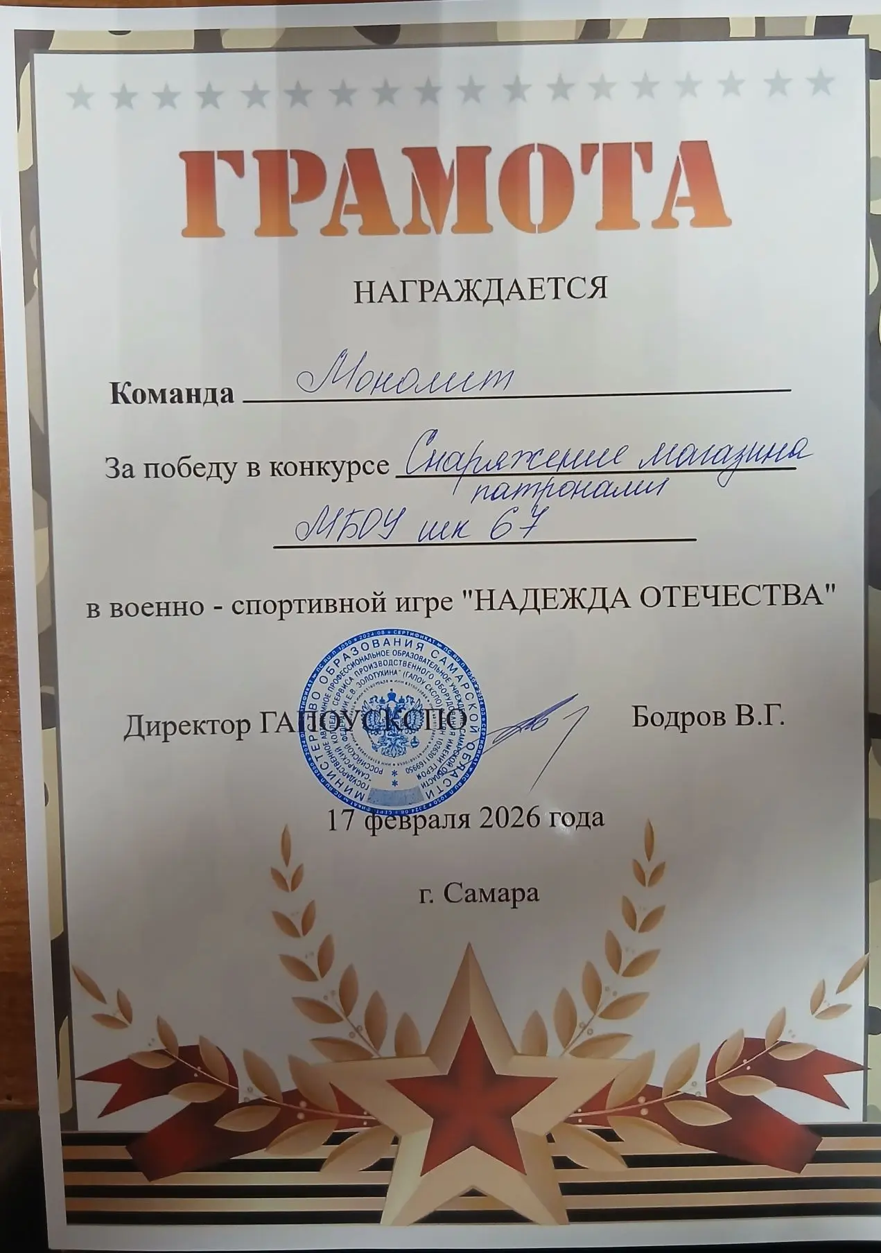 17 февраля команда "Монолит" в составе обучающихся 9-х классов приняла участие в военно-спортивной игре "Надежда Отечества", посвящённой Дню защитника Отечества.