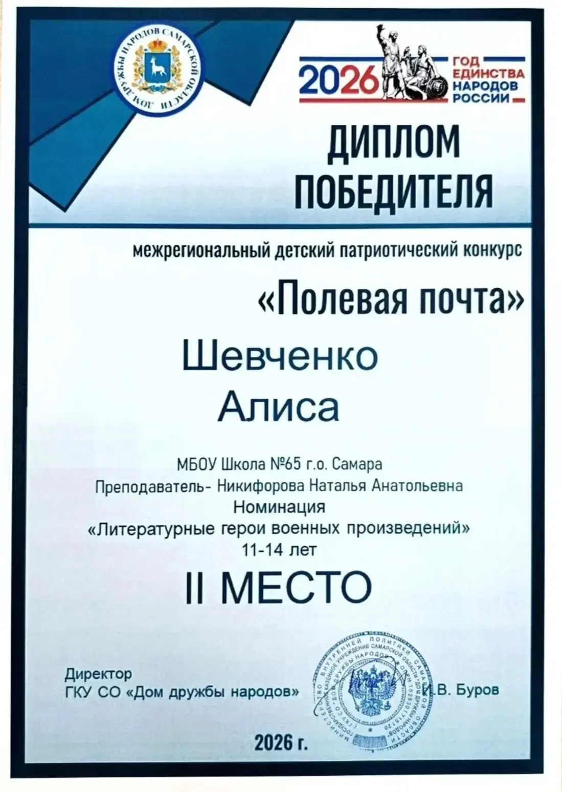 Алиса стала победителем межрегионального патриотического конкурса "Полевая почта" и заняла 2 место!🏆