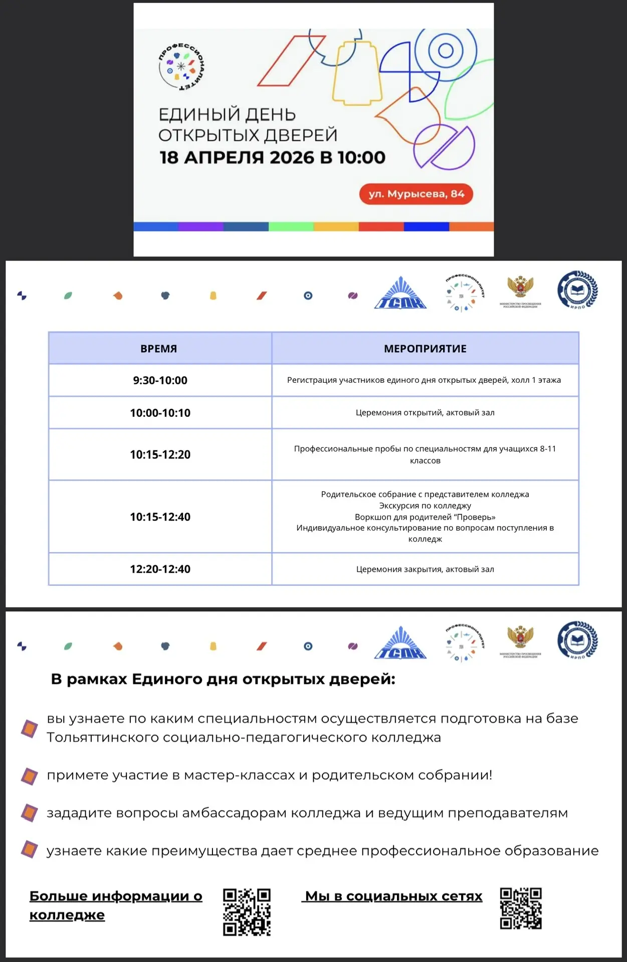 В рамках проведения Единых дней открытых дверей в колледжах профессионалитета 18.04.2026 в 11.00 пройдёт областное родительское собрание в формате онлайн "Профессионалитет-63".Для участия в собрании необходимо зарегистрироваться по ссылке: https://click.ru/3Spv72