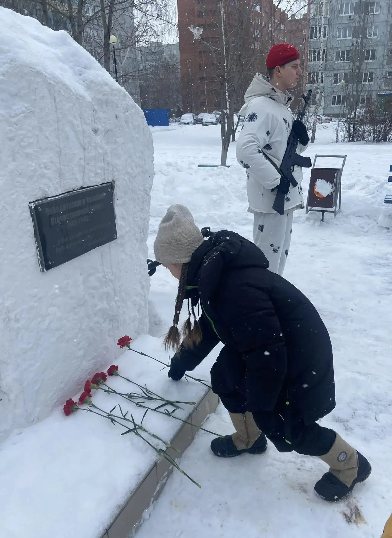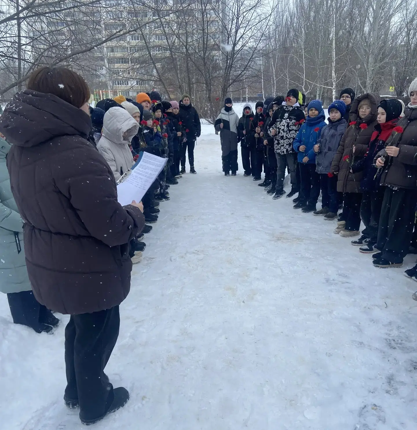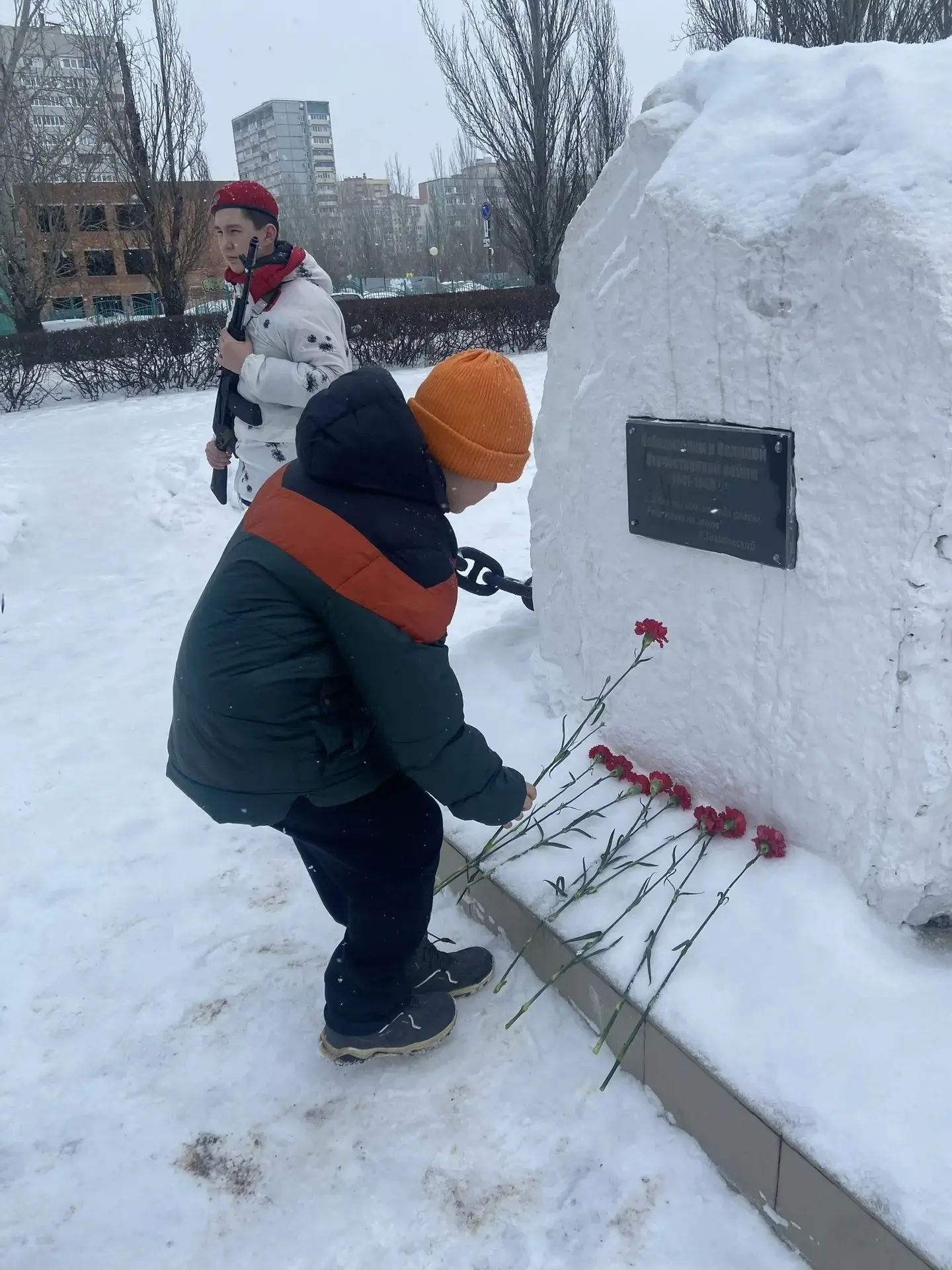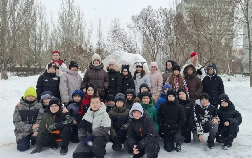 В рамках месячника патриотического воспитания в нашей школе прошла ежегодная акция «Живые цветы на снегу»🥀, в которой приняли участие учащиеся 4-х классов. Во время церемонии возложения цветов юнармейцами был дан салют в память о погибших героях.🎗