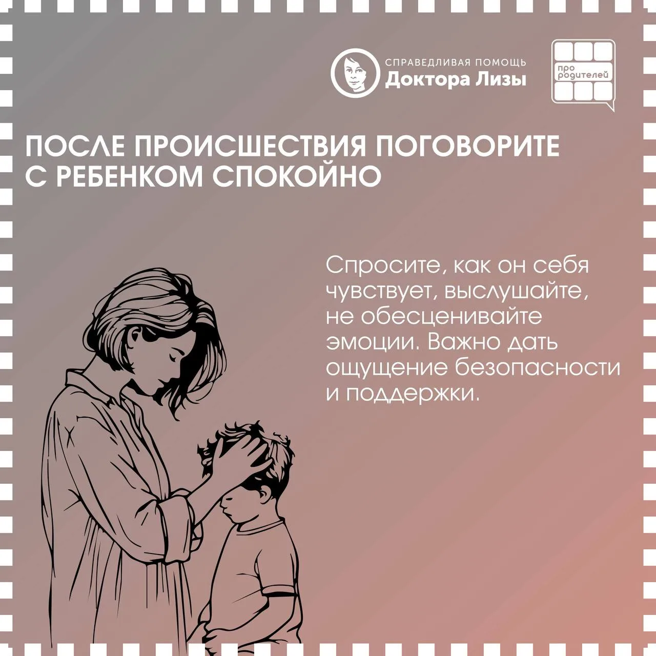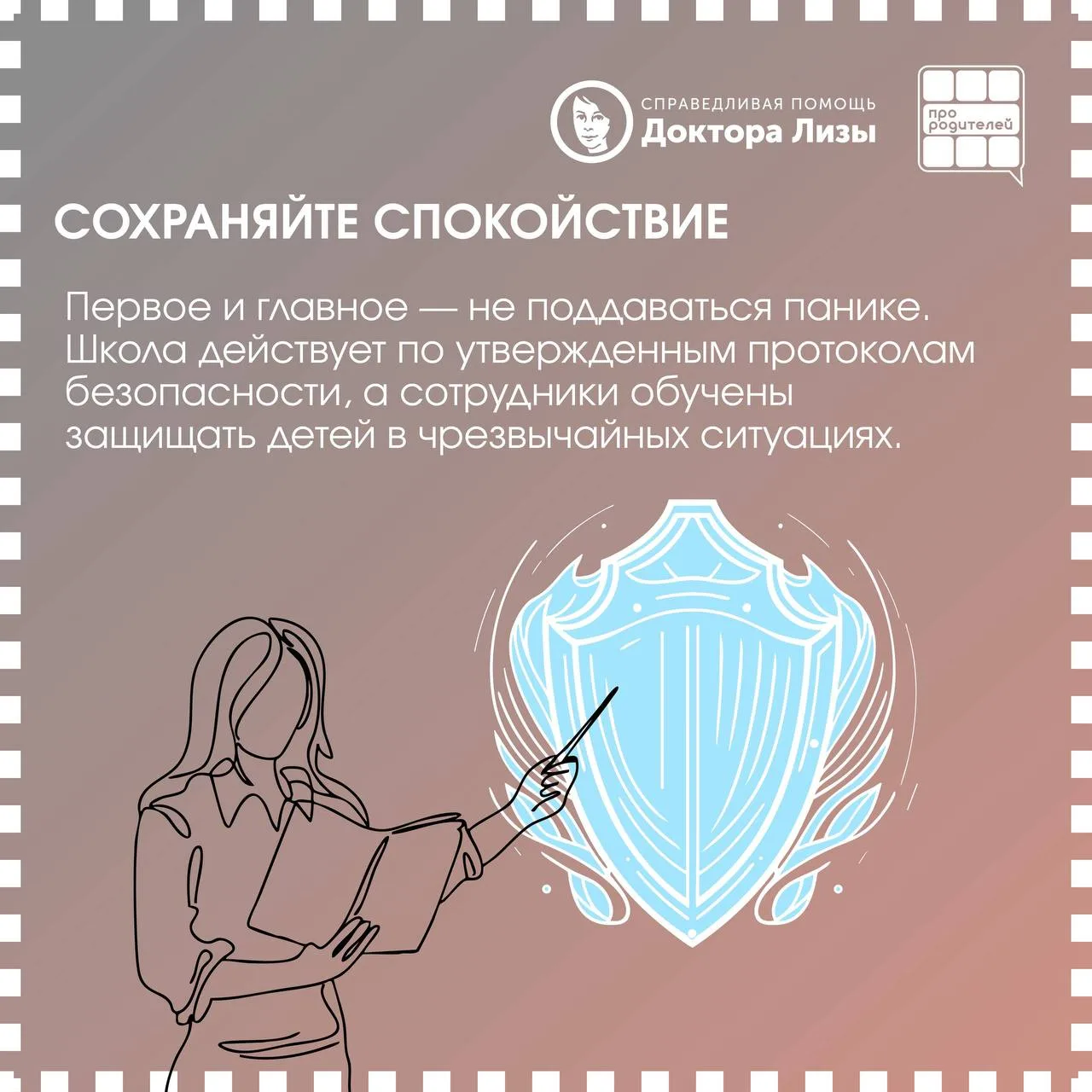 🤝 Совместно с МБОО «Справедливая помощь Доктора Лизы» мы подготовили карточки — в них четкий и спокойный алгоритм для родителей: что делать, если во время атаки БПЛА ребенок находится в школе.