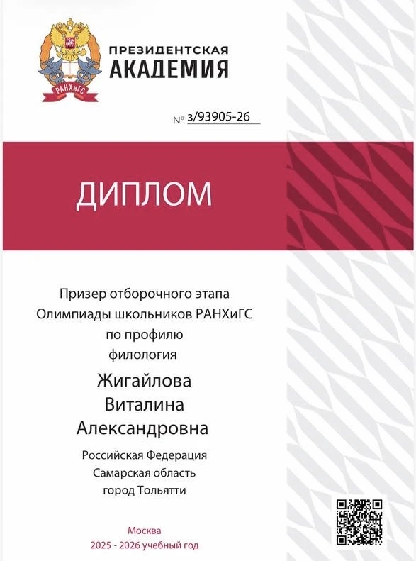 Ученица 11 класса Виталина Жигайлова представила школу на заключительном этапе Олимпиады РАНХиГС по филологии!