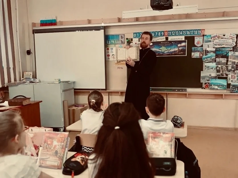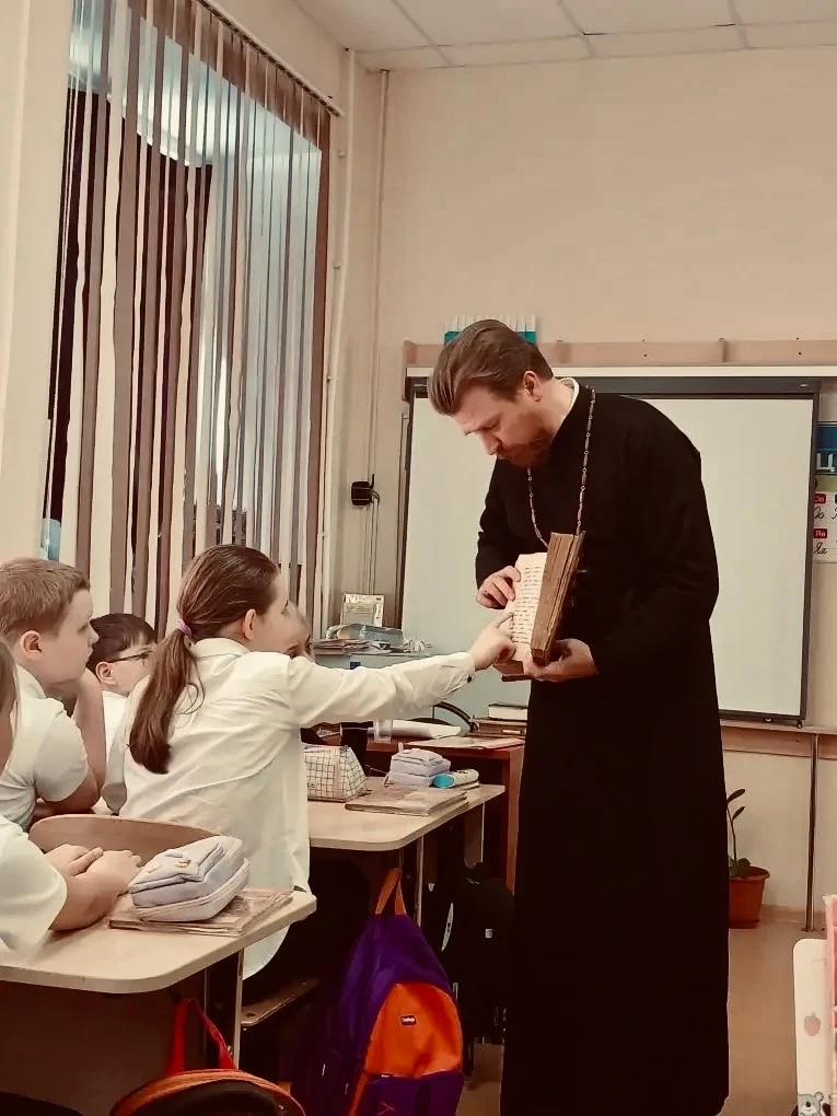 📚 Отец Михаил принёс и показал детям православные издания: Евангелие, молитвословы, книги для детей о святых и добрых поступках. Третьеклассники с интересом рассматривали их.