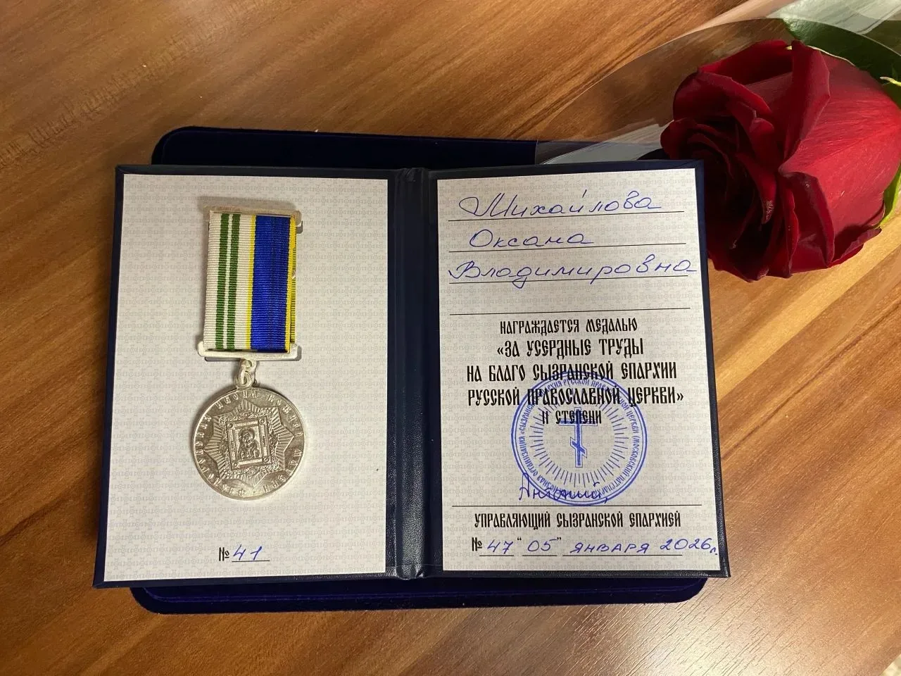10 января 2026 г. в Вознесенском монастыре г. Сызрани епископ Сызранский и Шигонский Антоний вручил медаль ll степени " За усердные труды на благо Сызранской епархии русской православной церкви" учителю начальных классов Михайловой Оксане Владимировне. Наши поздравления коллеге и слова благодарности за её труд!