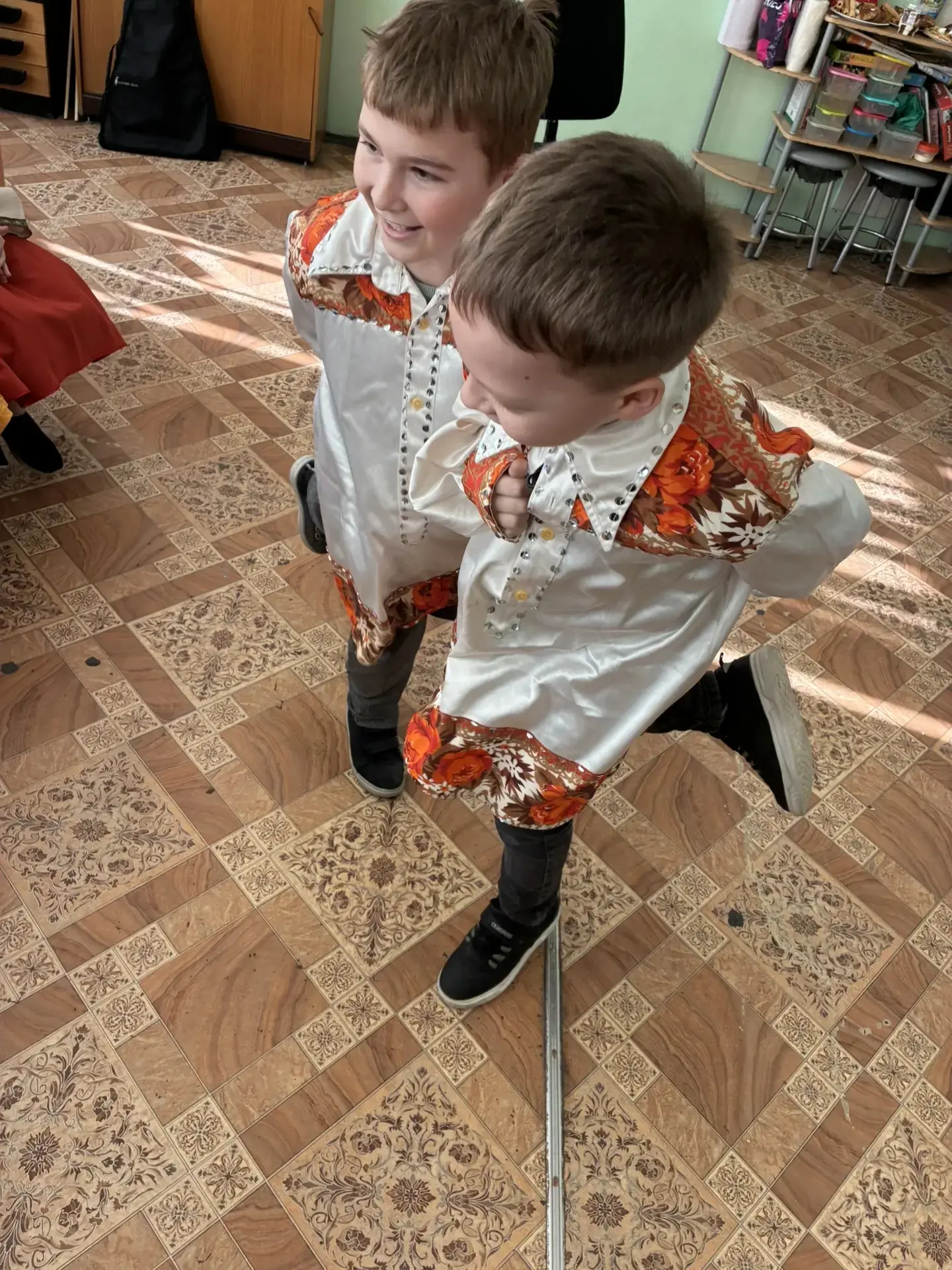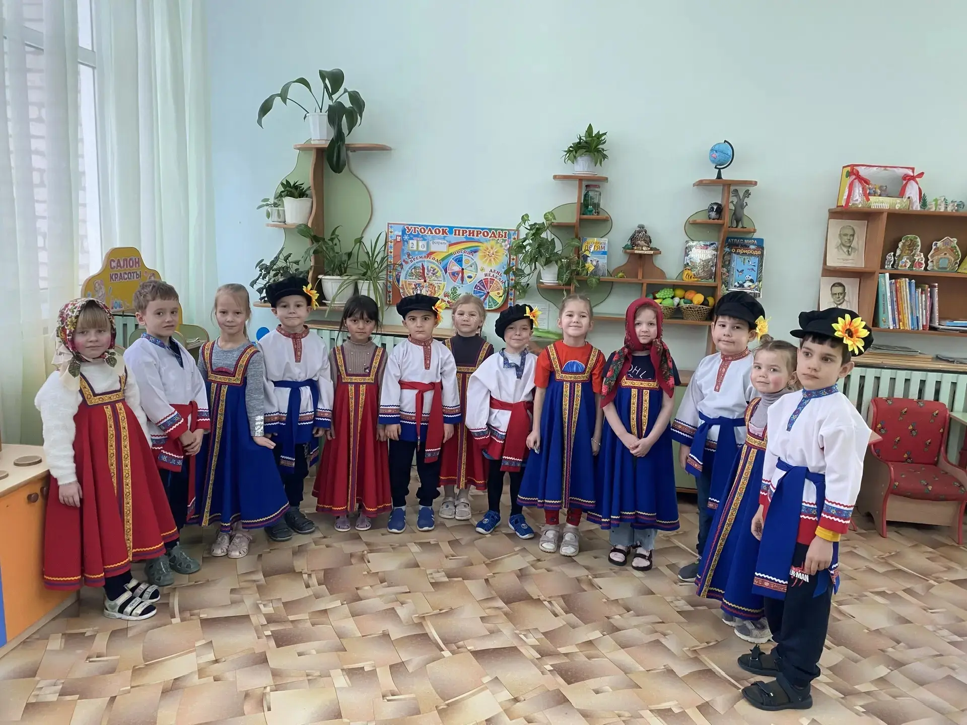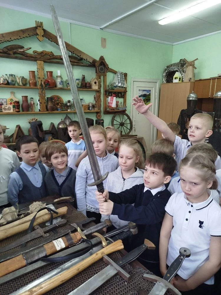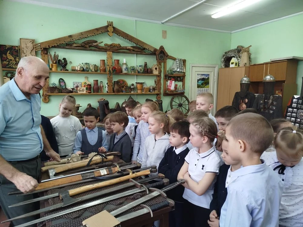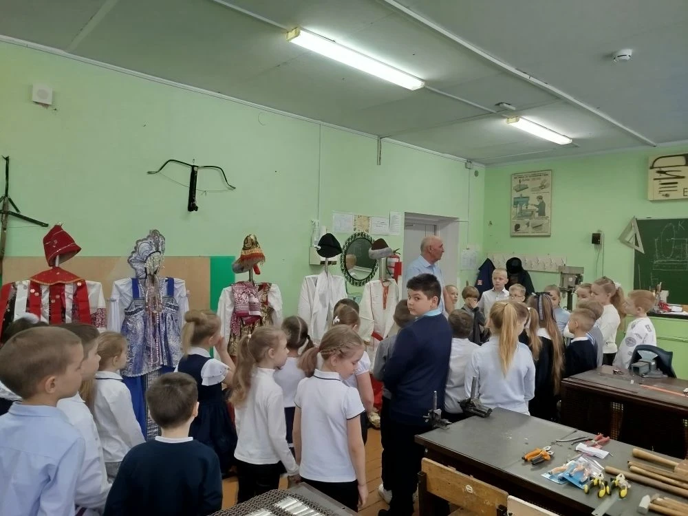 Преподаватель истории школы Александр Михайлович Храмов, который является организатором музея и руководителем школьного клуба «Кустари», рассказал ребятам об истории русского национального костюма. Малыши узнали, как называются элементы костюма, их предназначение. Каждая деталь одежды имела глубокий смысл. В русском народном костюме символика проявлялась в разных элементах: в цветах, в геометрических узорах, в вышивке и в головных уборах. Символика отражала мировоззрение русского народа, его верования, представления о мироздании и месте человека в нём.