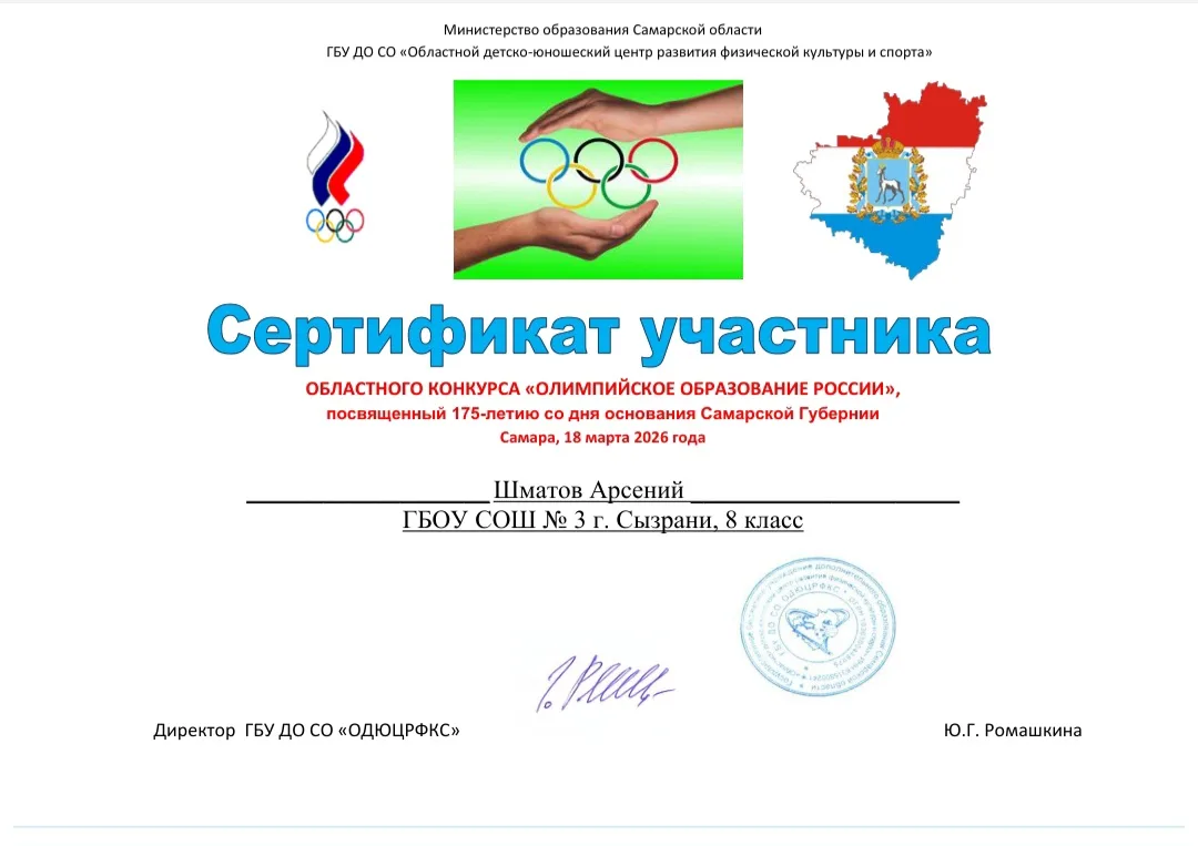 🌟 Обучающийся 8️⃣ «Б» класса ГБОУ СОШ №3 г. Сызрани, Шматов Арсений, являясь призёром окружного этапа, достойно представил свой город на областном уровне 🏆. Арсений продемонстрировал высокий уровень спортивной эрудиции, блеснув знаниями в различных номинациях конкурса. 💪.