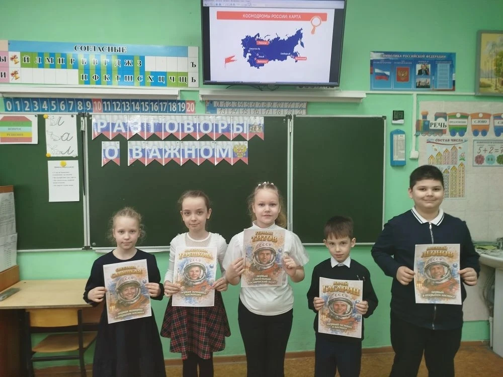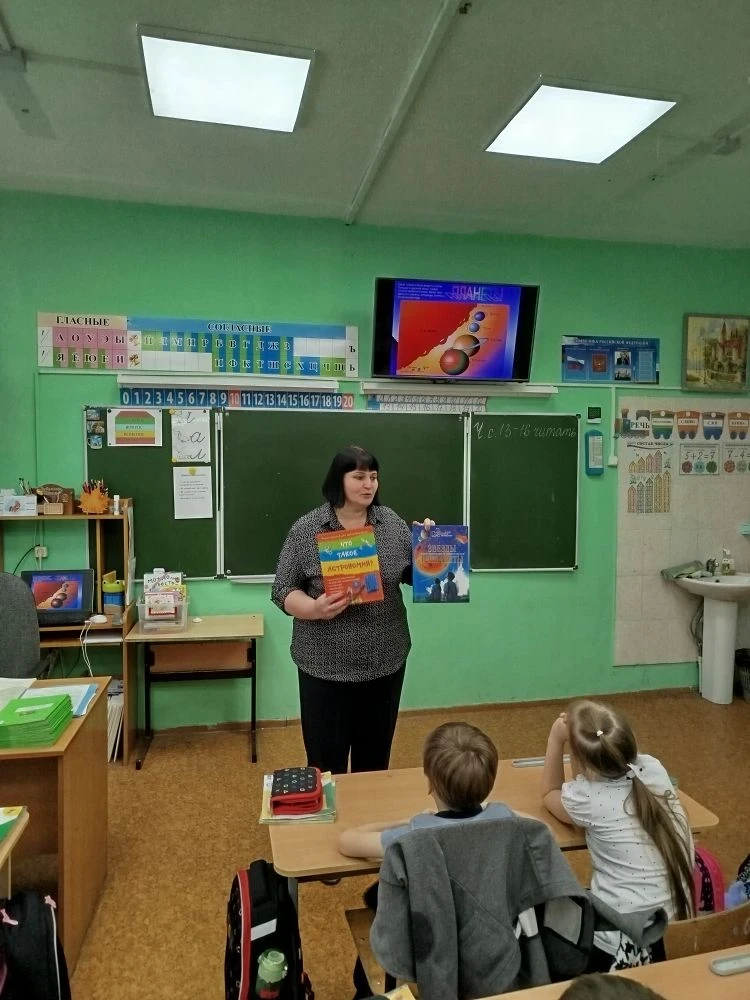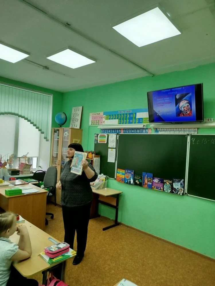 В преддверии Дня космонавтики 🛰️ в 1 "А" классе прошел познавательный классный час с элементами игры и чтения 📚. Библиотекарь детской библиотеки филиала № 16 имени Н.И.Подлесовой Блинкова Е.И. познакомила малышей с отрывками из книги М.Водопьянова «Юрий Гагарин – космонавт-1». Автор книги – прославленный летчик, Герой Советского Союза – рассказывает о первом космонавте Юрии Гагарине, с которым был знаком лично. Ребята узнали интересные факты о детстве и юности космонавта 🧑🚀.