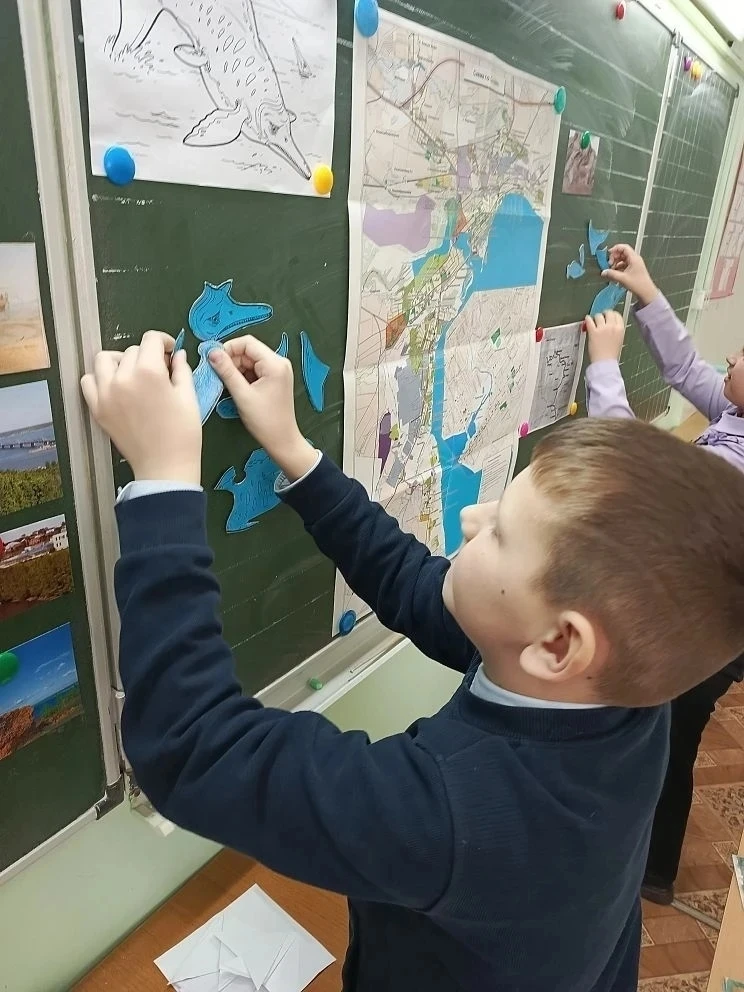 📚 Ребята отыскали реки на карте города, ответили на вопросы викторины об обитателях рек, собрали 🧐 скелет ихтиозавра и провели 🍵 опыт с фильтрацией воды.
