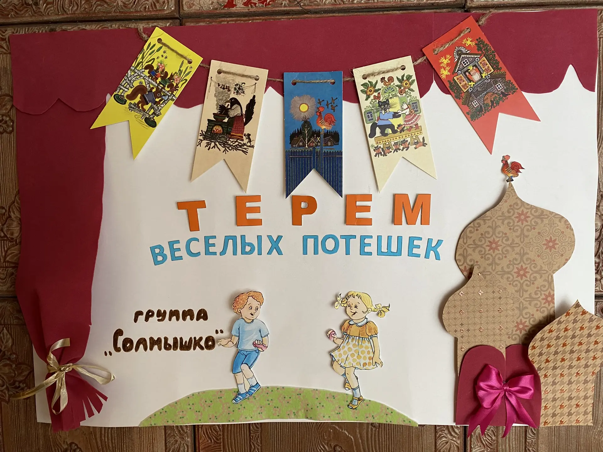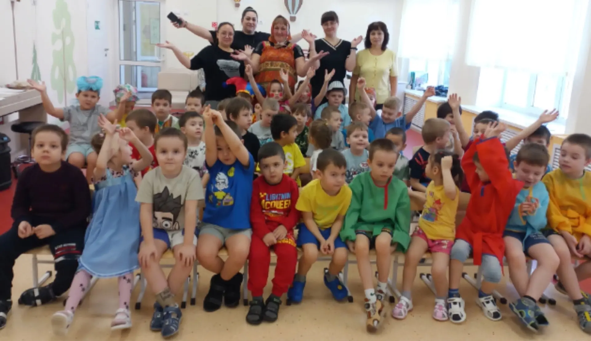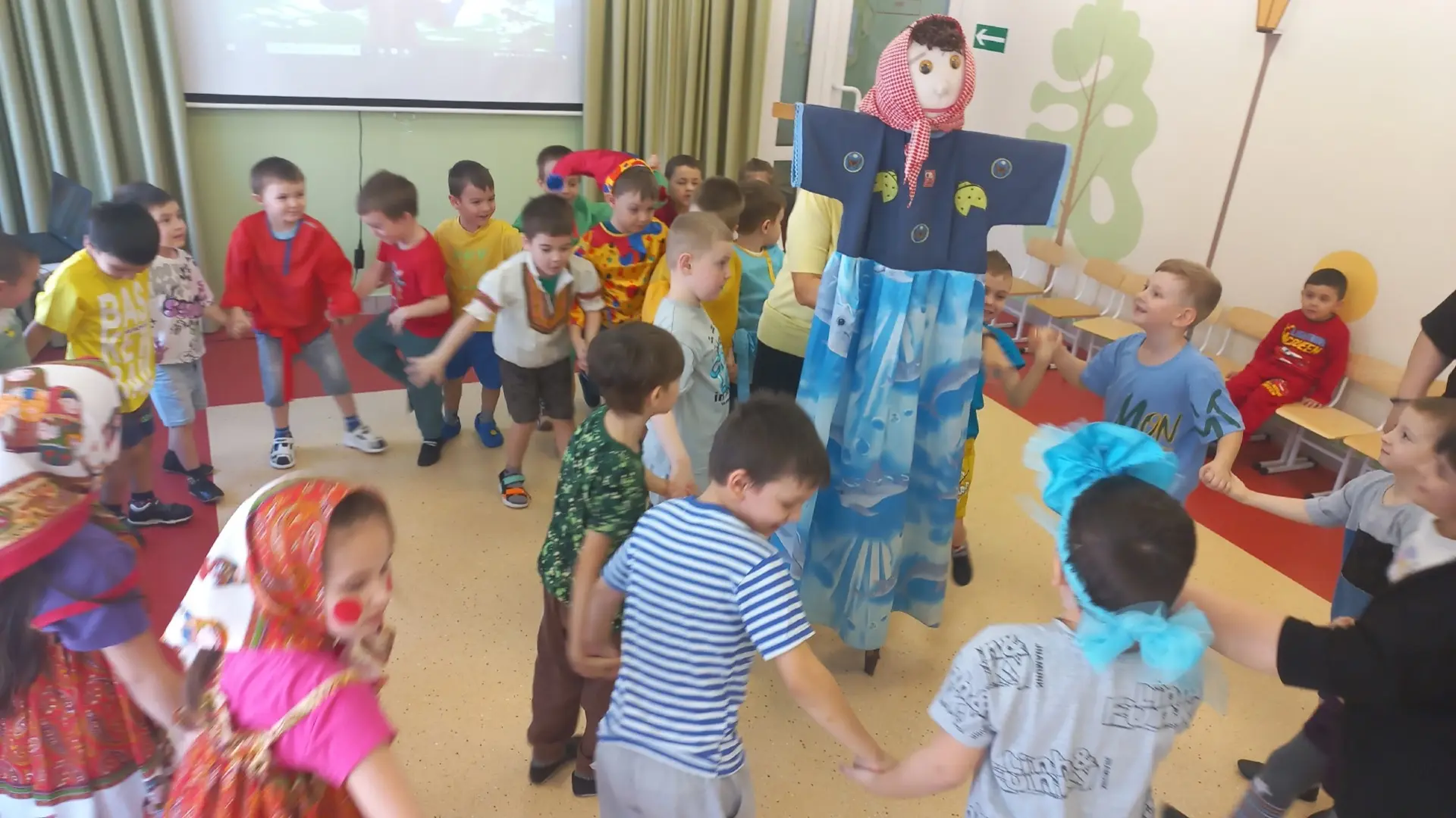 Ребята играли, водили хороводы, смотрели театральное представление на большом экране, где участники были скоморохи.