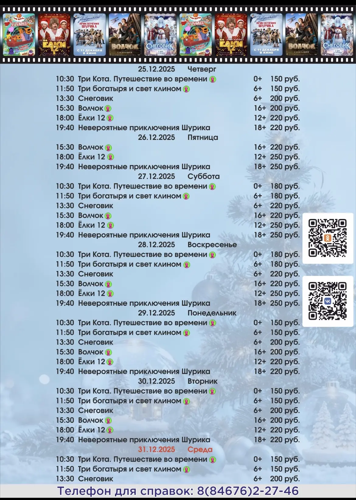 Вашему вниманию предлагается список фильмов, доступных по программе «Пушкинская карта» на период с 25 по 31 декабря ККЗ Юбилейный: