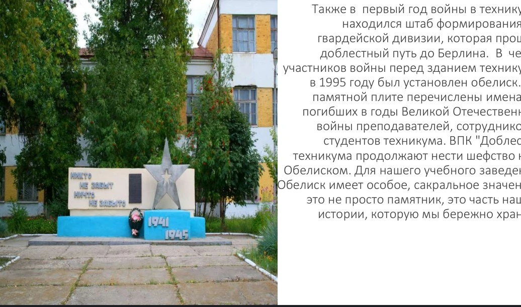📌Также в первый год войны в техникуме находился штаб формирования 57 гвардейской дивизии, которая прошла доблестный путь до Берлина. В честь участников войны перед зданием техникума в 1995 году был установлен Обелиск. На памятной плите перечислены имена 24 погибших в годы Великой Отечественной войны преподавателей, сотрудников и студентов техникума. Для нашего учебного заведения Обелиск имеет особое, сакральное значение, это не просто памятник, это часть нашей истории, которую мы бережно храним.Из года в год ВПК "Доблесть" техникума несут шефство над Обелиском.
