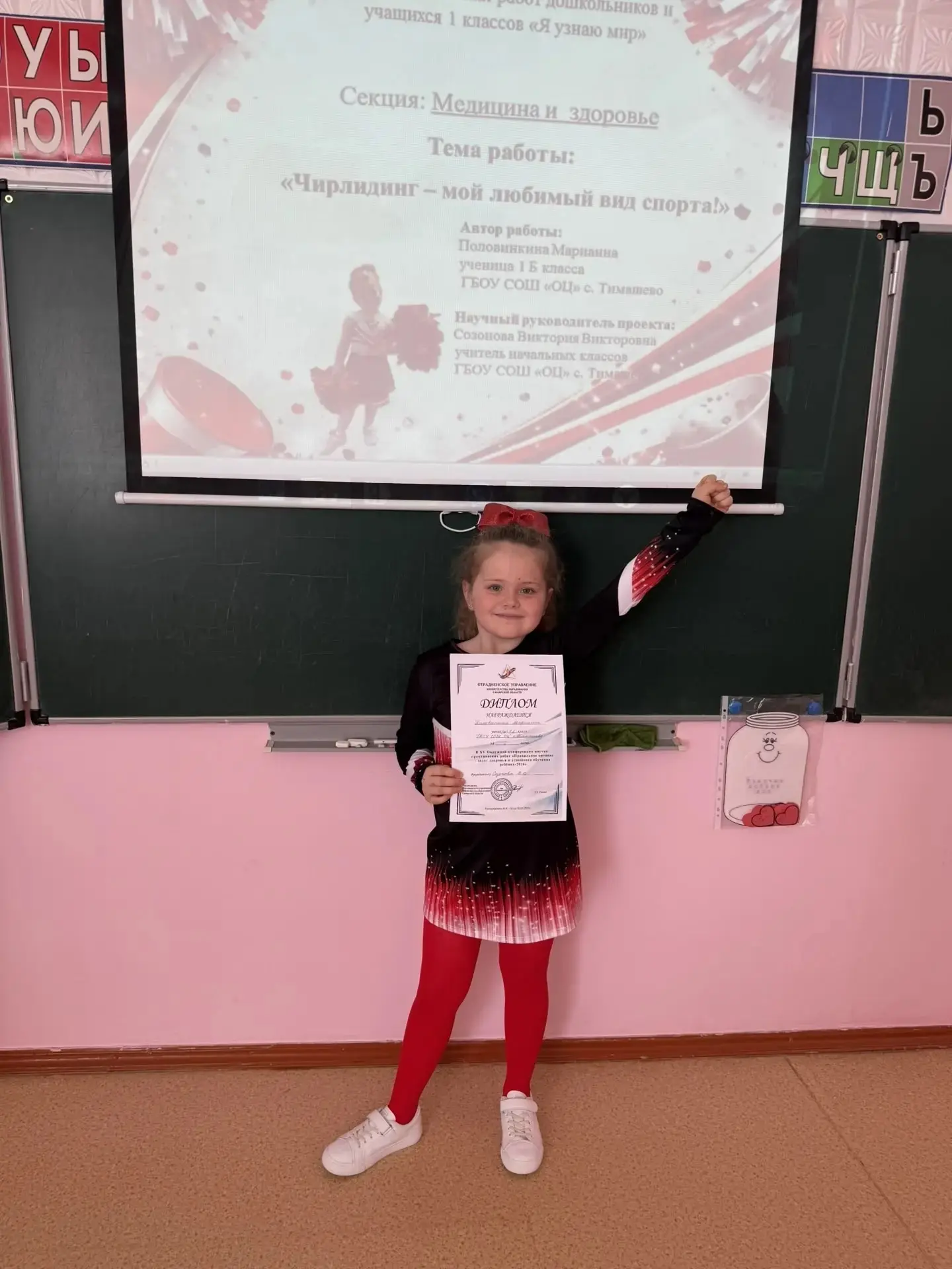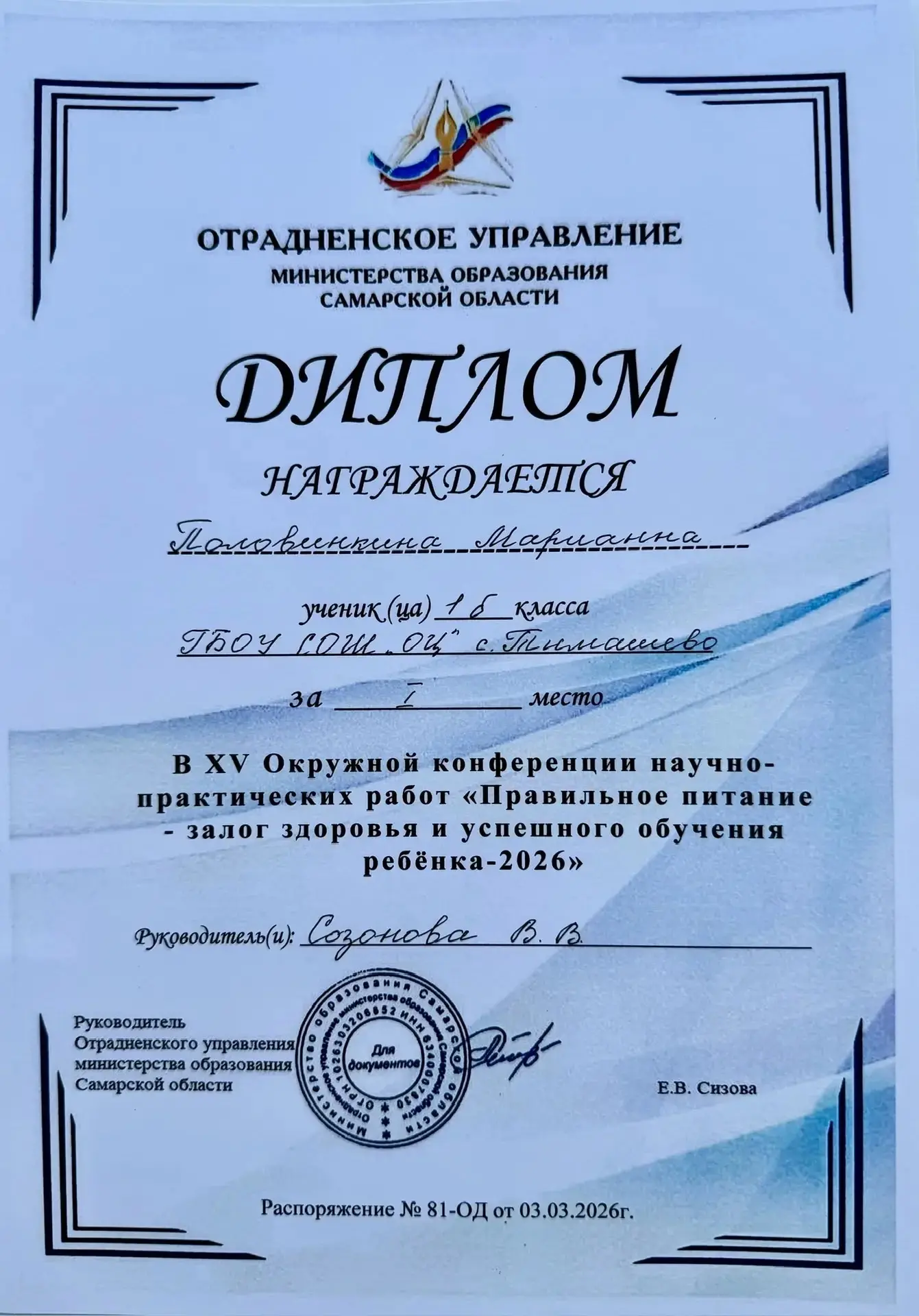 Ученица 1Б класса Образовательный центр с.Тимашево Половинкина Марианна заняла почётное 1 место🥇 в XV окружной конференции научно-практических работ "Правильное питание - залог здоровья и успешного обучения ребёнка 2026"