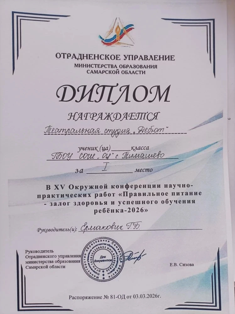 19 марта 2026 года на базе ГБОУ СОШ «ОЦ» с Тимашево прошла XV окружная научно-практическая конференция исследовательских работ дошкольников и учащихся 1-6 классов «Правильное питание – залог здоровья и успешного обучения ребенка»