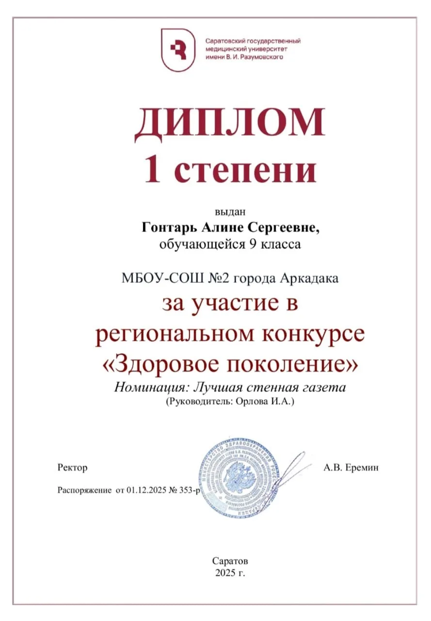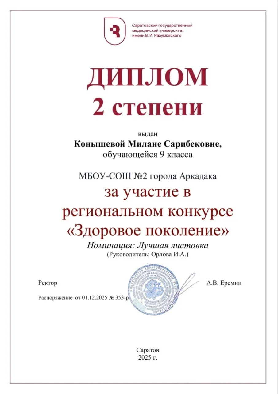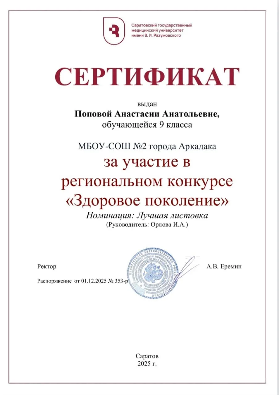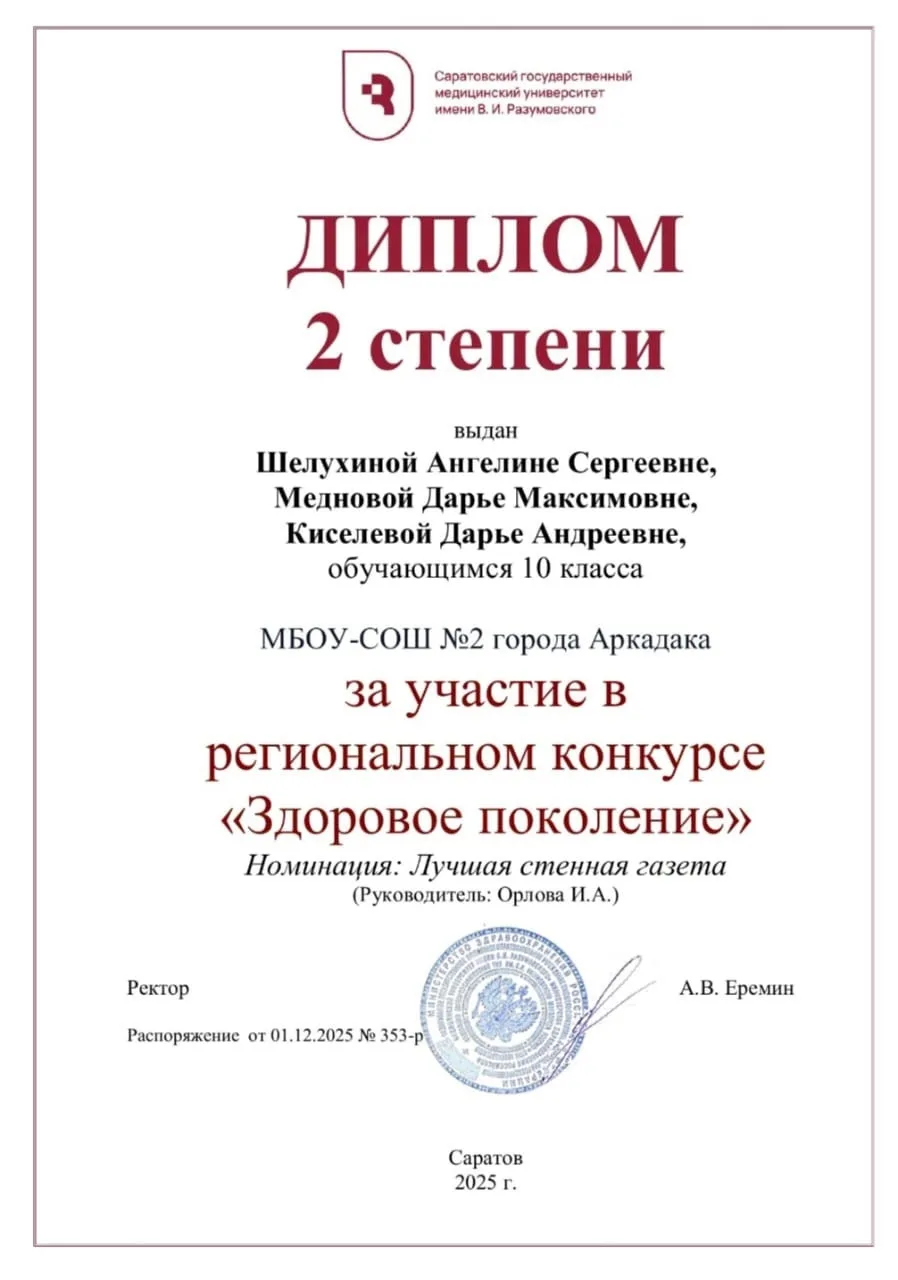Учащиеся медицинского класса нашей школы принимали участие в региональном конкурсе "Здоровое поколение" от Саратовского государственного медицинского университета им В.И. Разумовского и заняли призовые места. Поздравляем ребят с заслуженной победой.