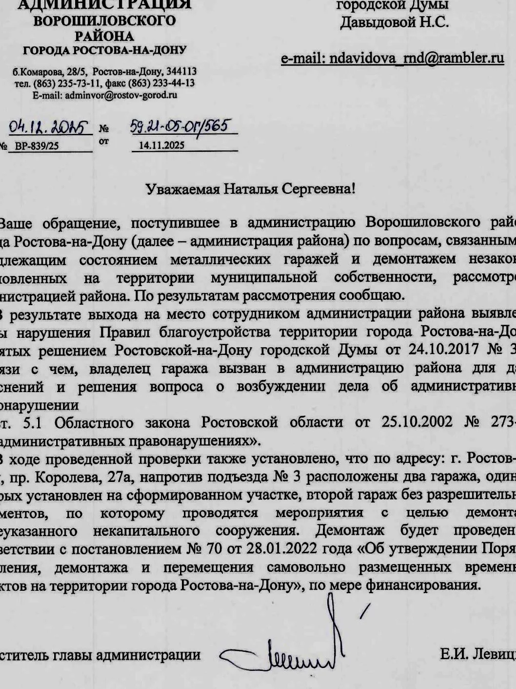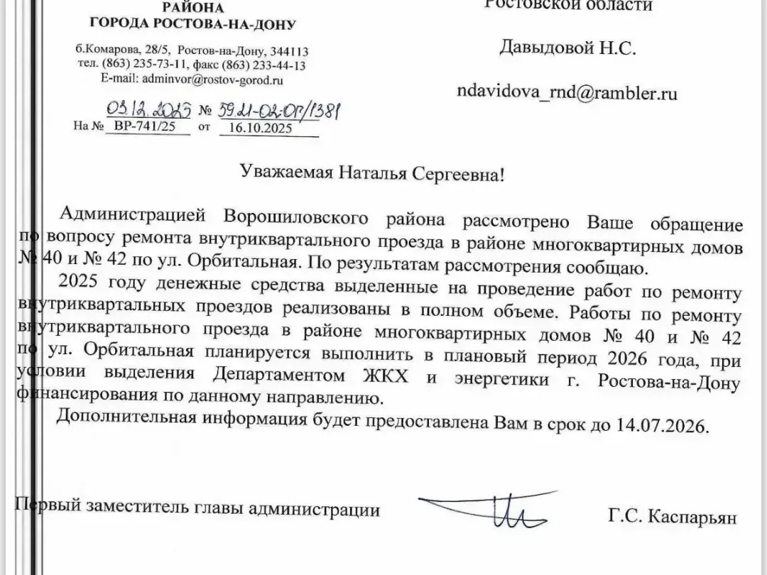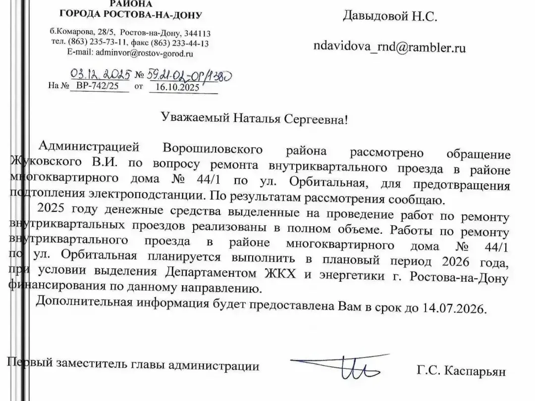 📨В связи с этим мною был направлен запрос в администрацию Ворошиловского района с просьбой оказать содействие в решении данного вопроса. В настоящее время получен официальный ответ.