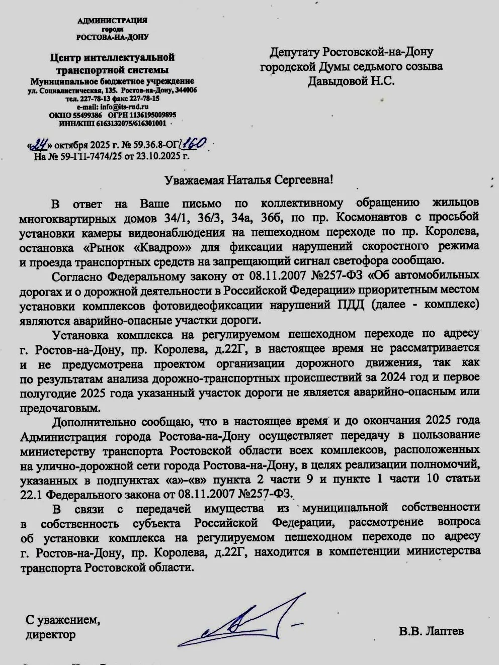 📝Я взяла это обращение в работу и направила официальный запрос заместителю главы Администрации города Ростова-на-Дону, курирующему транспорт и дорожное хозяйство. На сегодняшний день получен официальный ответ.