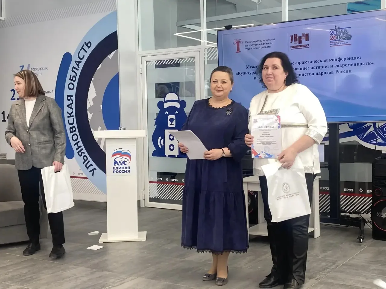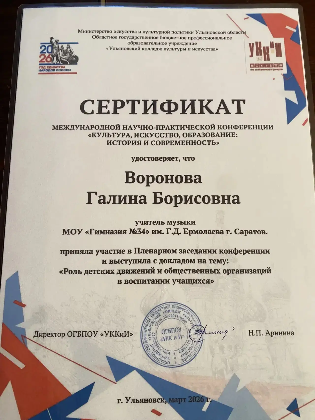 12-13 Марта учитель музыки нашей гимназии Воронова Галина Борисовна приняла участие в Пленарном заседании Международной научно- практической конференции педагогов «Культура, искусство, образование» с докладом « Роль детских движений и общественных объединений в воспитании учащихся» в городе Ульяновске.