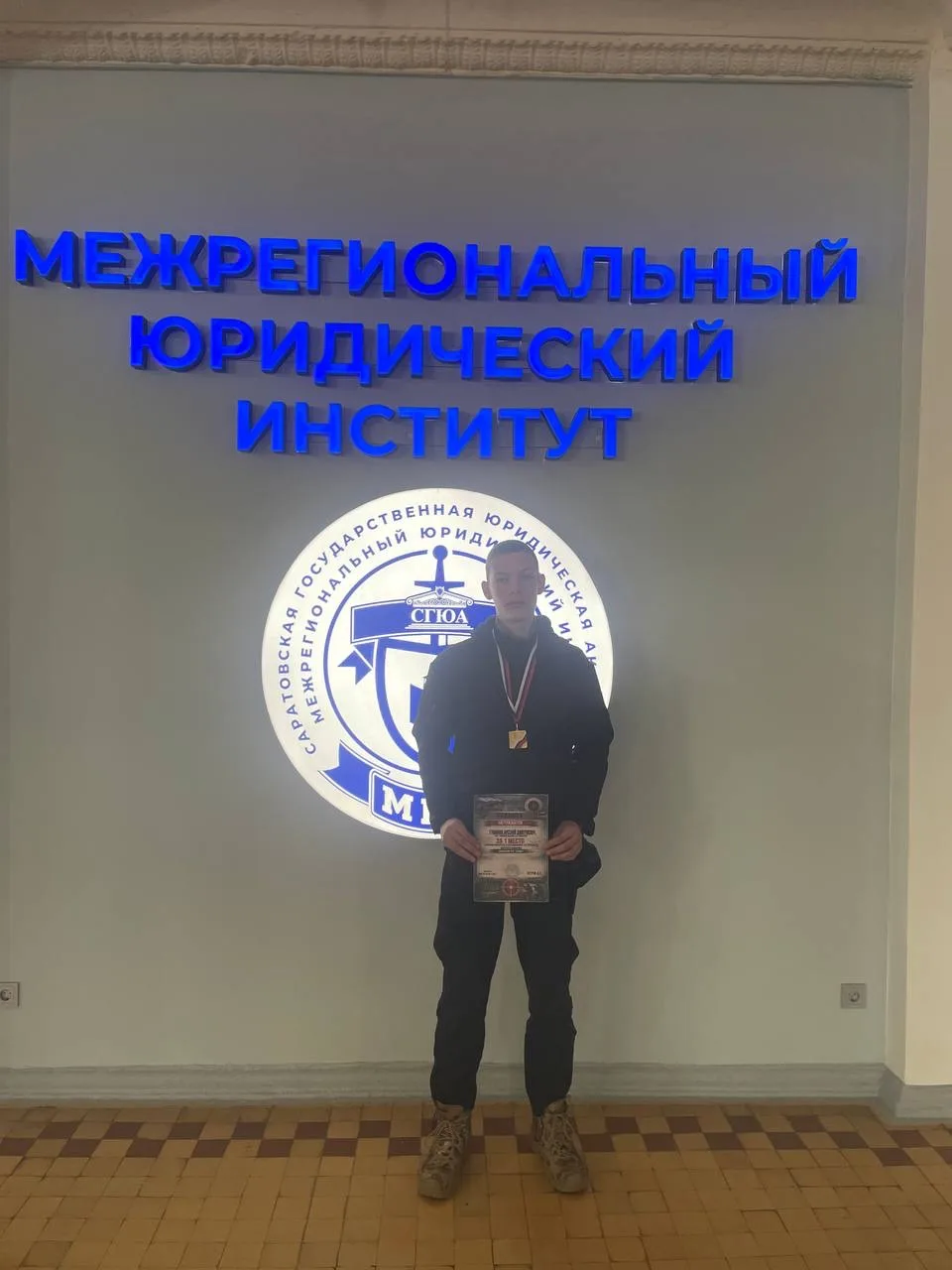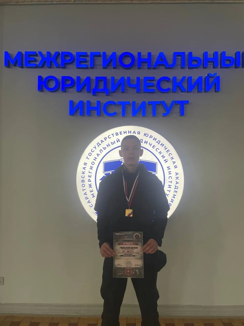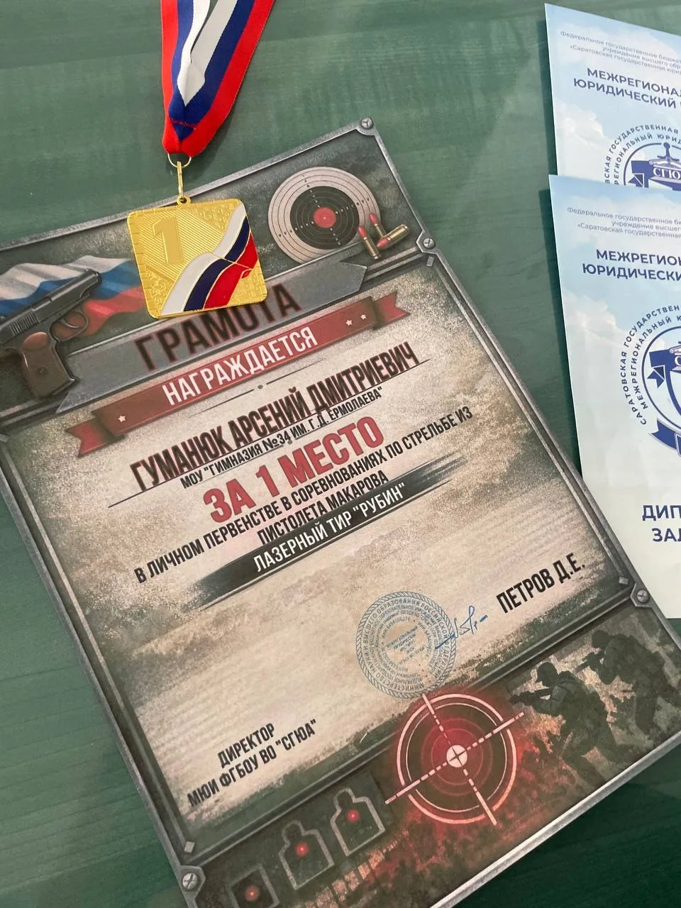Ученик 8 «В» Арсений Гуманюк занял первое место в личном первенстве соревнованиях по стрельбе из пистолета Макаров в Межрегиональном юридическом институте ФГБОУ ВО "СГЮА" среди обучающихся 8-11 классов общеобразовательных организаций.