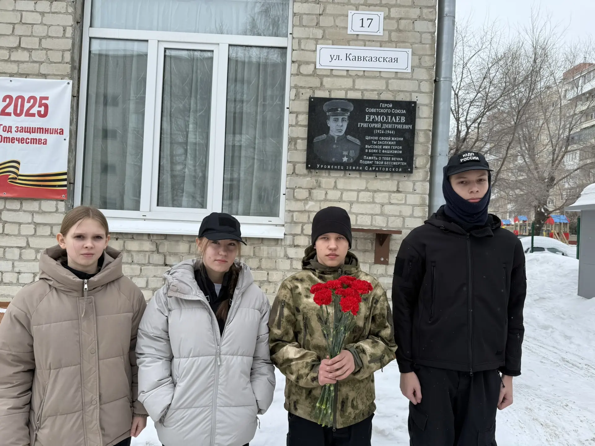 Активисты отряда ЮДП присоединились к Всероссийской акции, посвященной памяти защитников земли Русской. В рамках мероприятия они почтили память героя, возложив цветы к мемориальной доске Г. Д. Ермолаева.