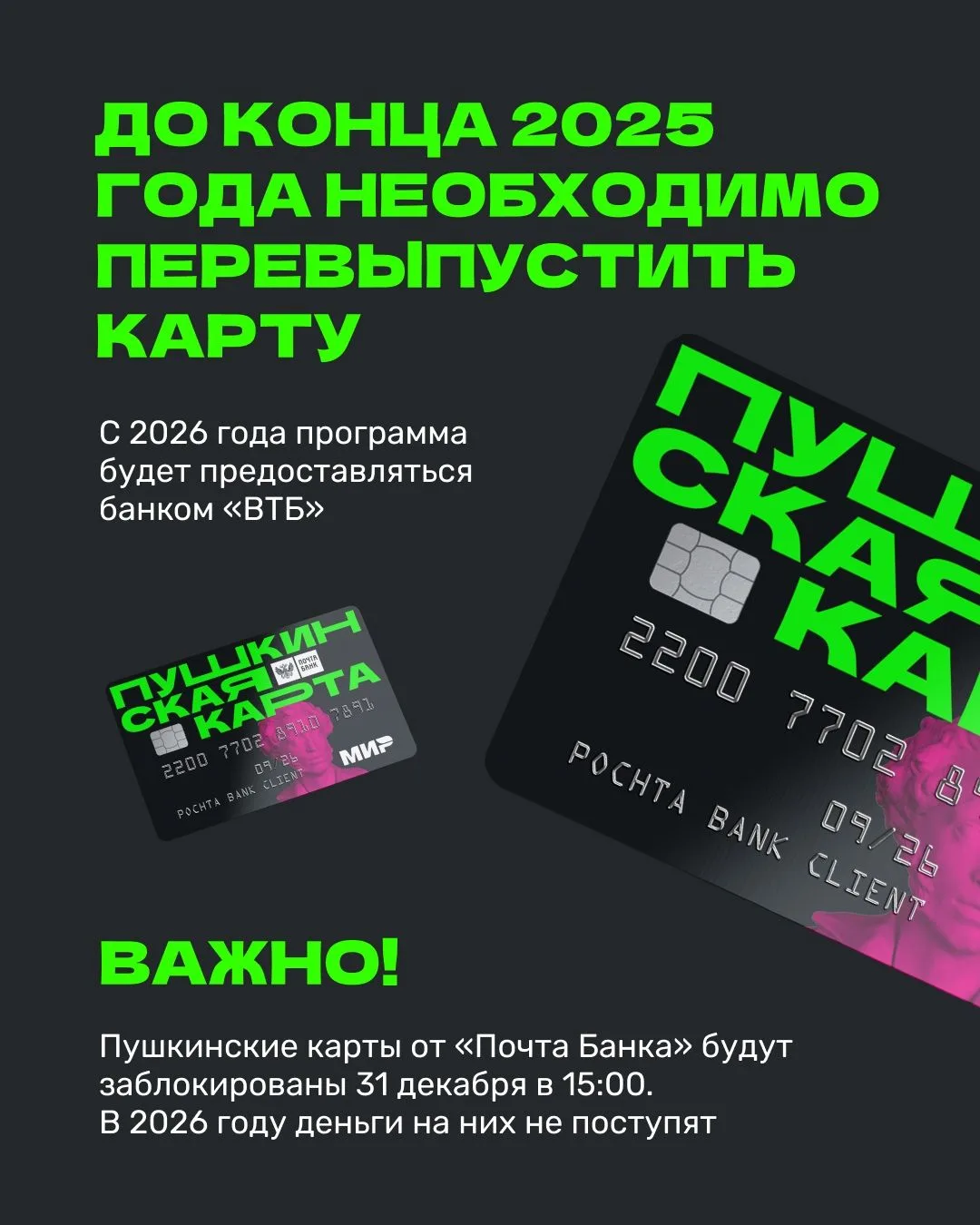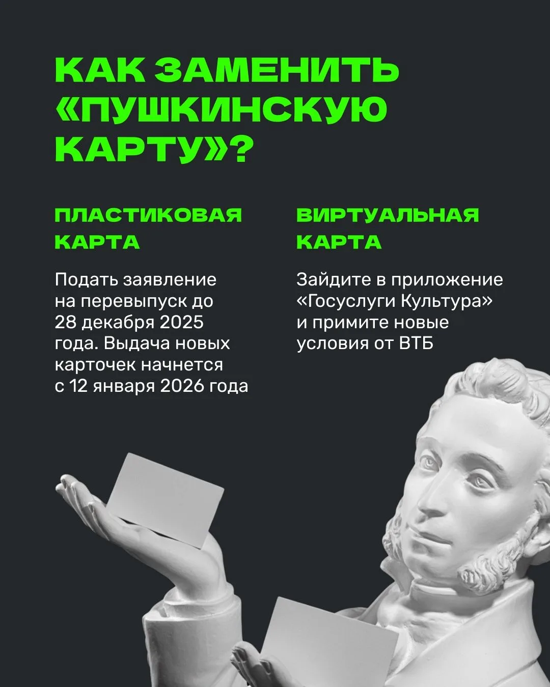 «Пушкинская карта» меняет место жительстваС 2026 года услуги программы будут предоставляться банком ВТБ. До какого времени будет работать нынешняя карта? Как делать смену физической и виртуальной карты? Всё самое важное об этой новости уже здесь.