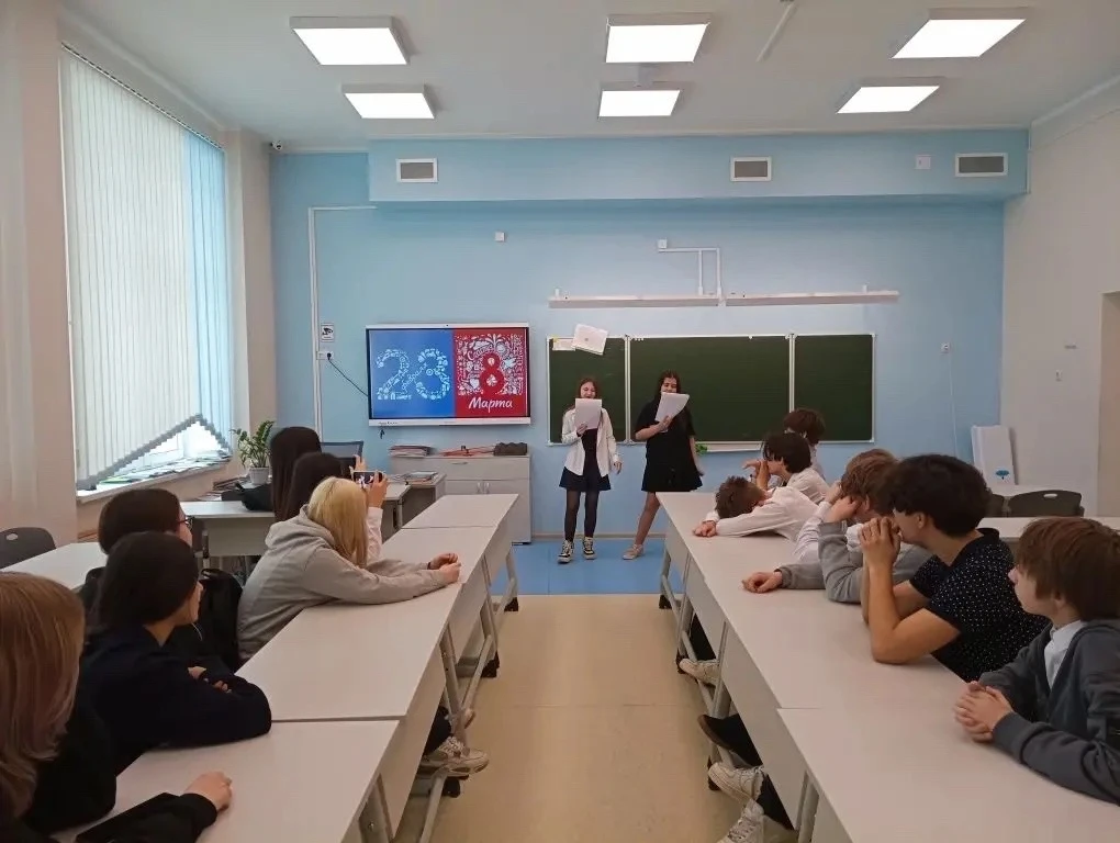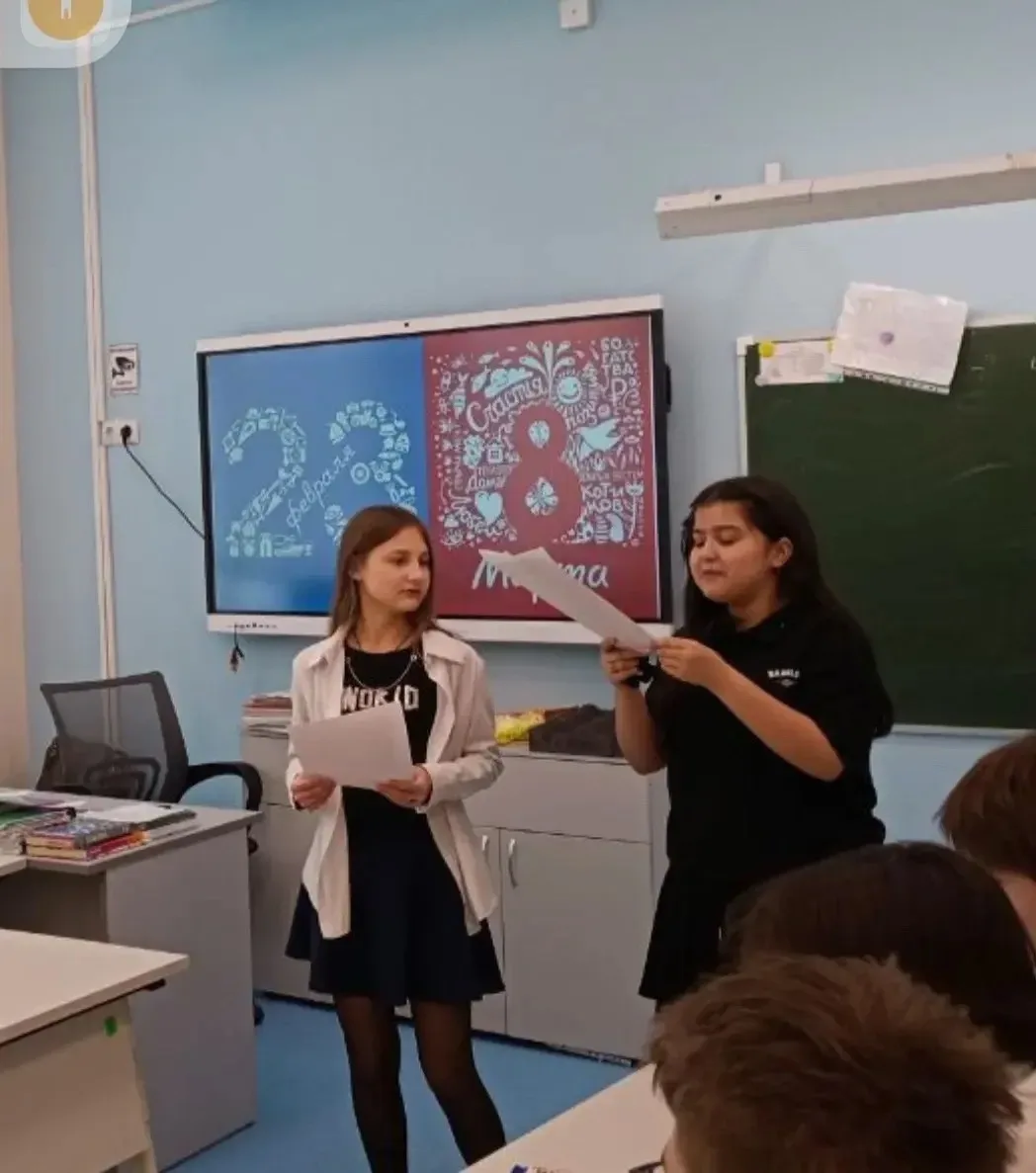 Ведущие: Исмаилова Фатима и Пивоварова Ксения поздравили мальчиков с прошедшим 23 Февраля, а девочек с наступающим 8 Марта!