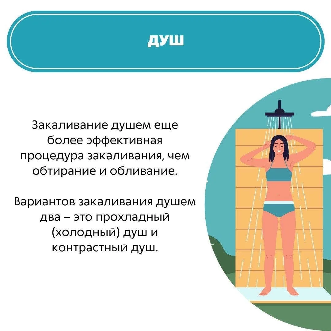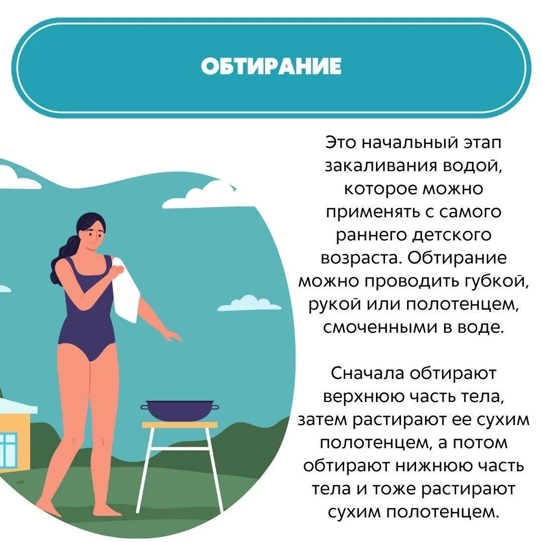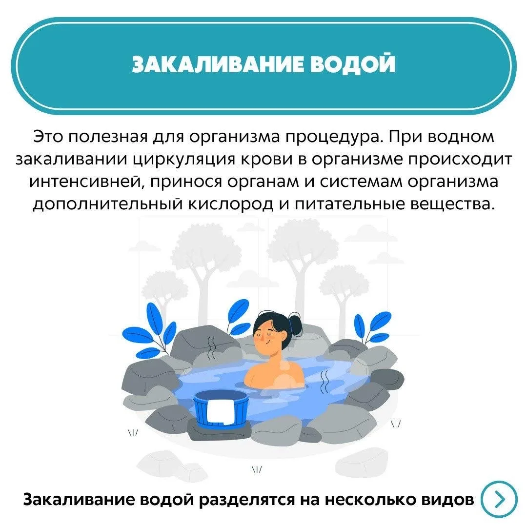 Существуют несколько видов закаливания в зависимости от проводимых процедур. Подробнее о каждом из них – в карточках✅