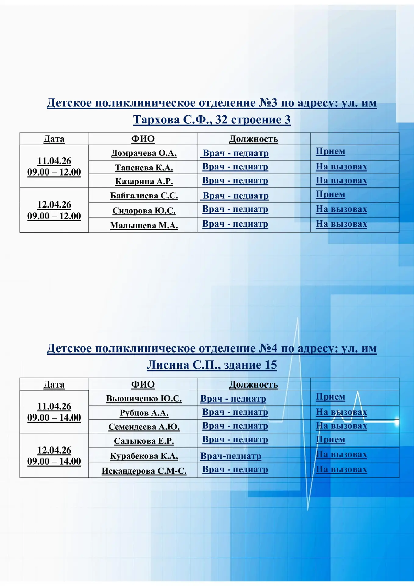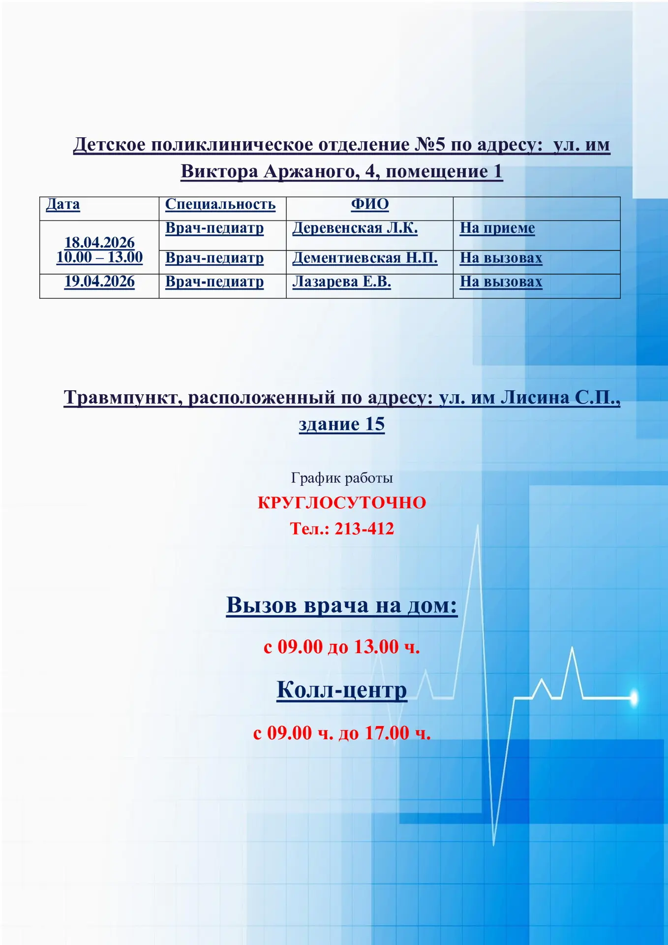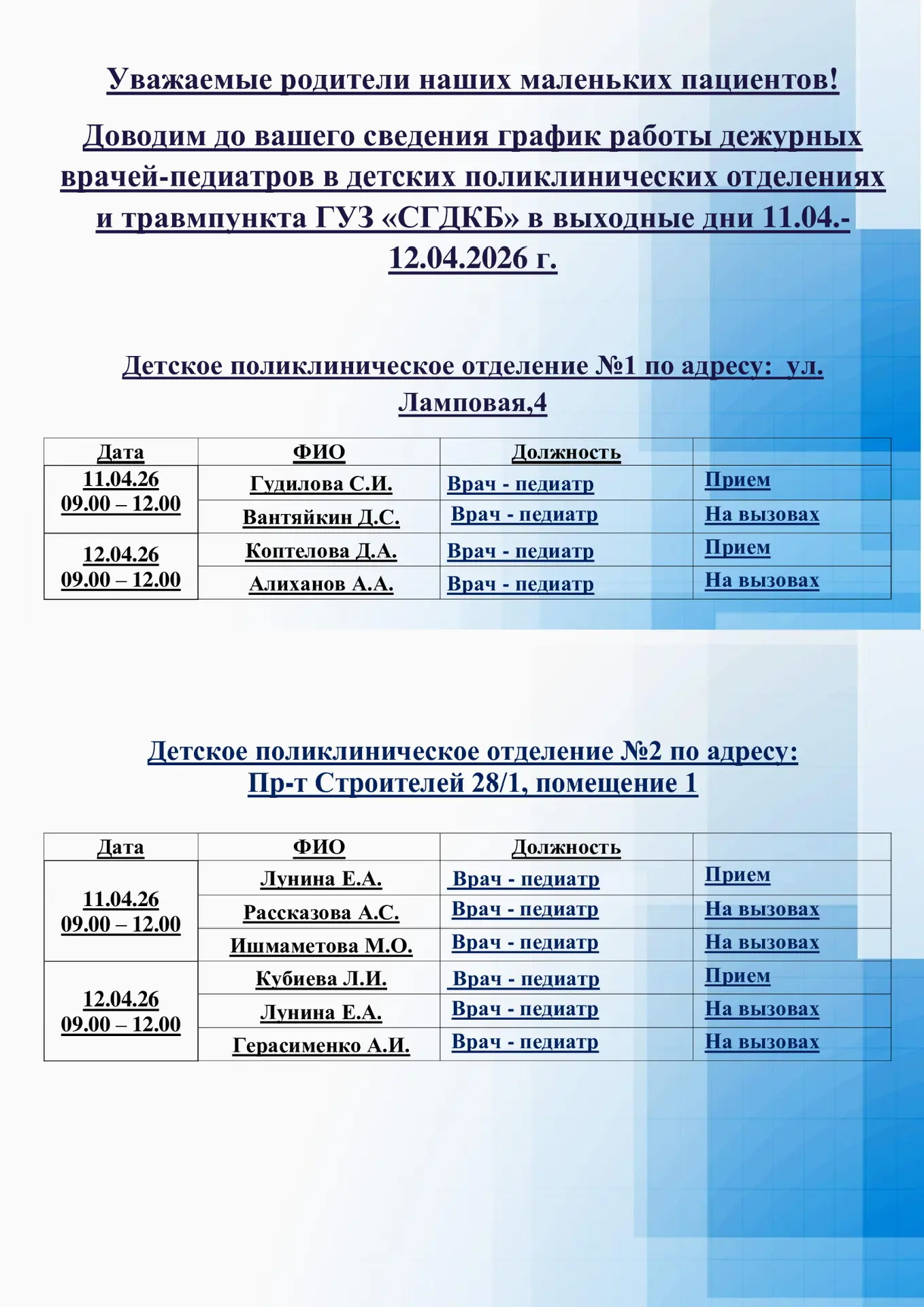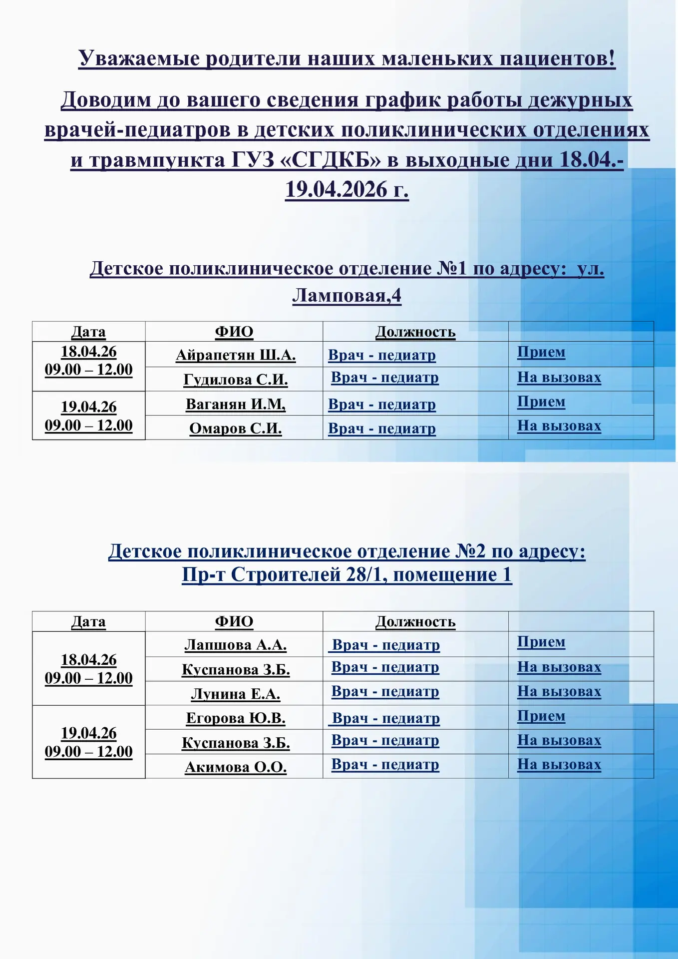 📑Доводим до вашего сведения график работы дежурных врачей-педиатров в детских поликлинических отделениях и травмпункта ГУЗ «СГДКБ» в выходные дни 18.04.-19.04.2026 г.