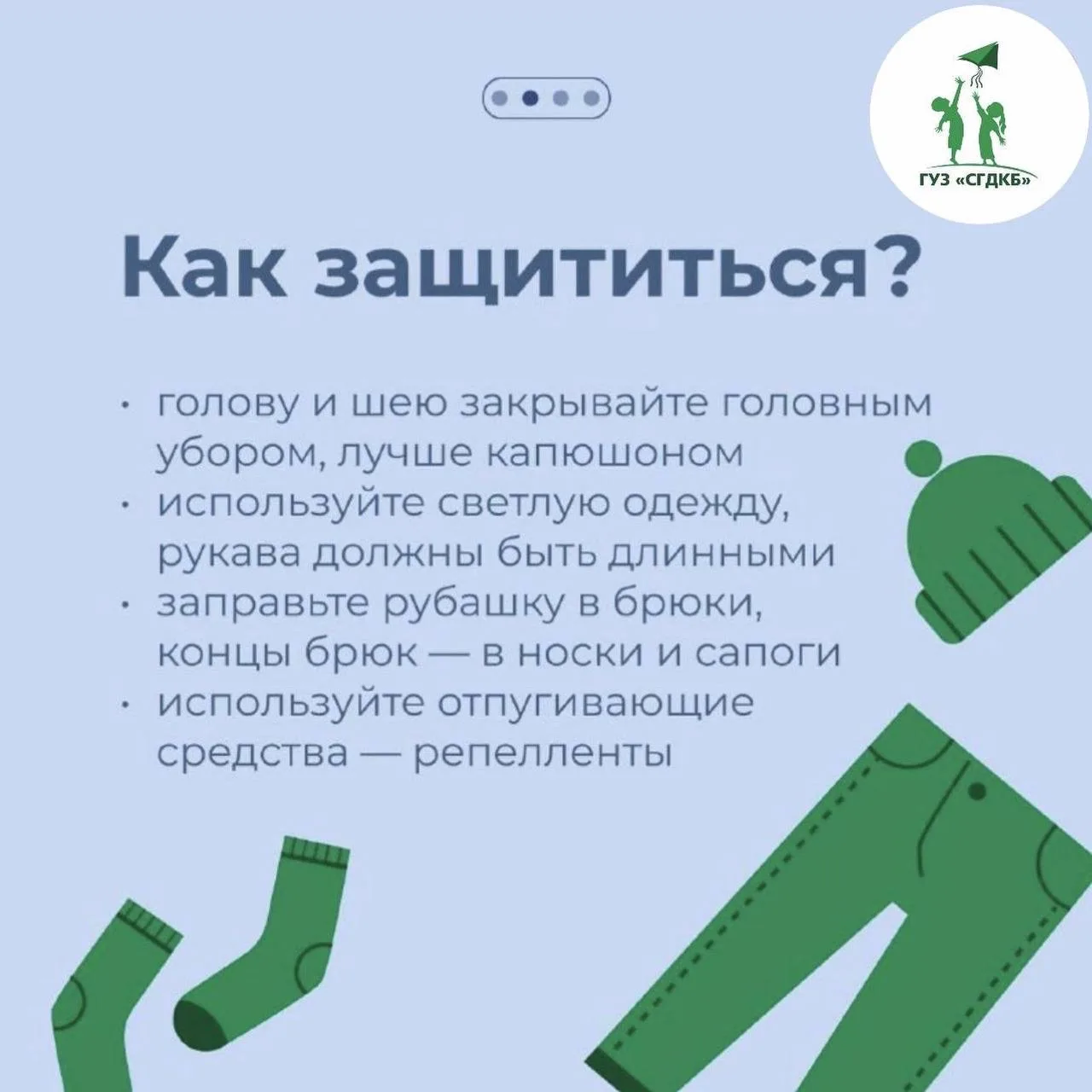 1. Одевайтесь правильно. Чем меньше открытых участков кожи, тем лучше.