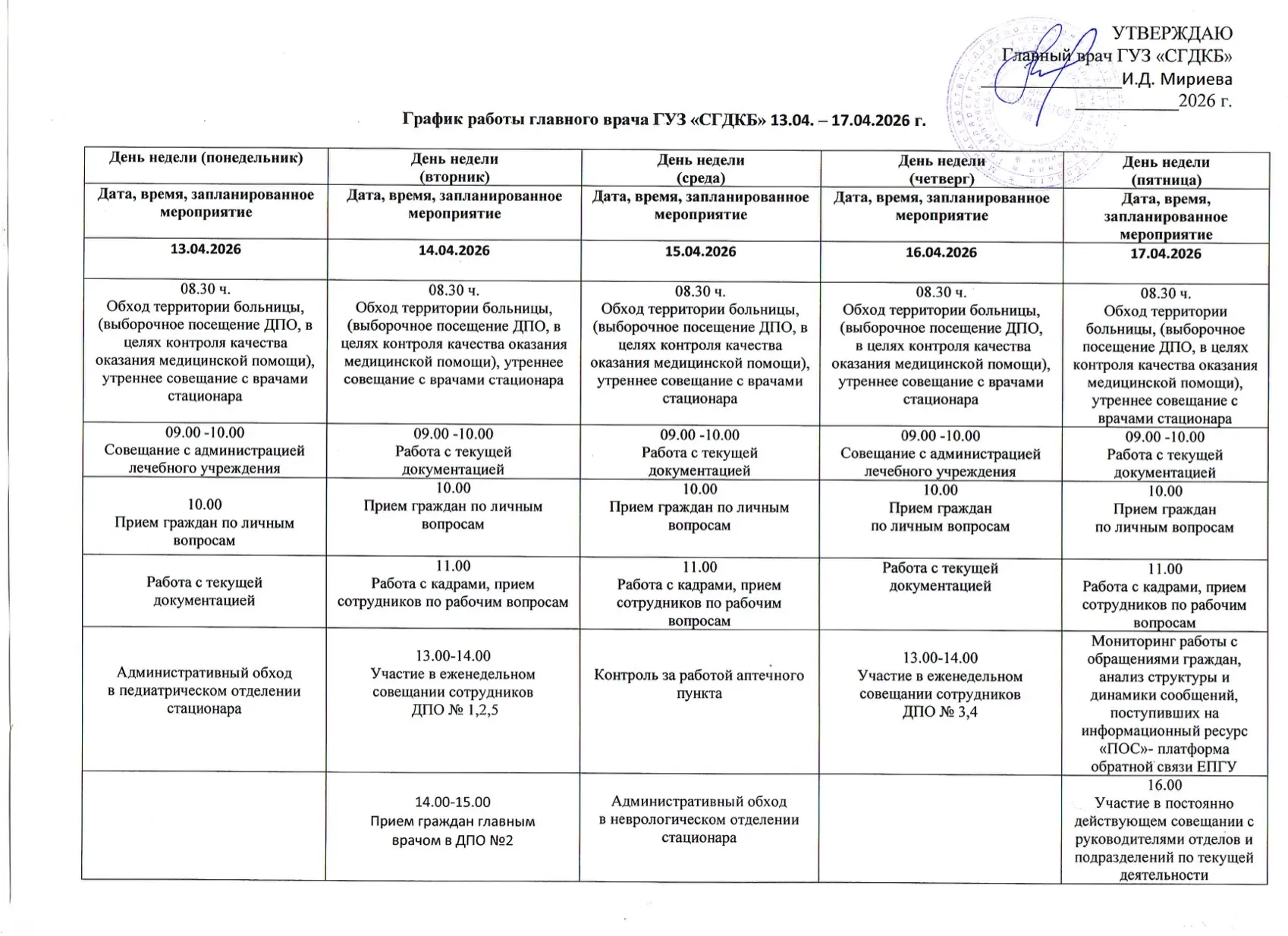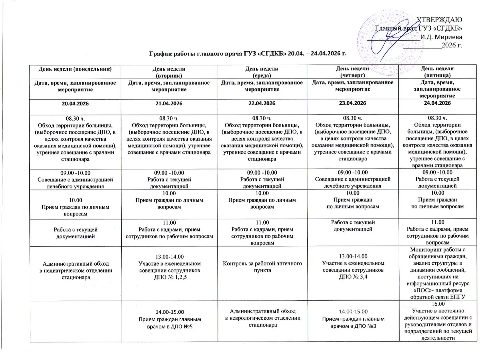 🩺График работы главного врача