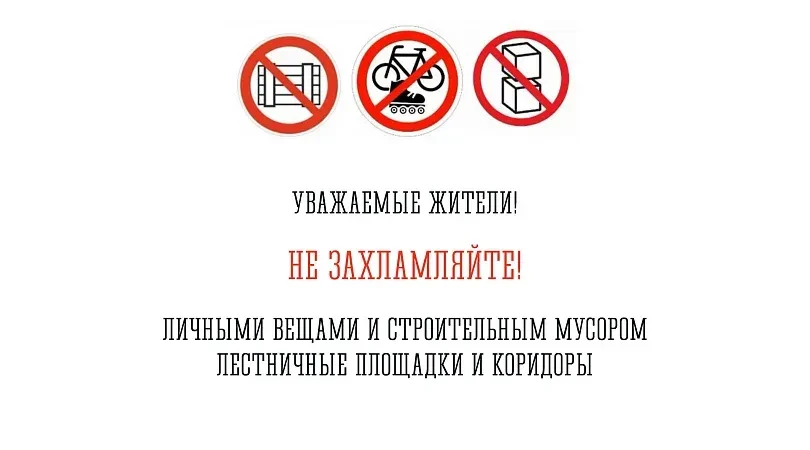 не оставляйте мебель, бытовую технику, коробки и другие вещи в местах общего пользования — на лестничных клетках и в коридорах, а также в колясочных.