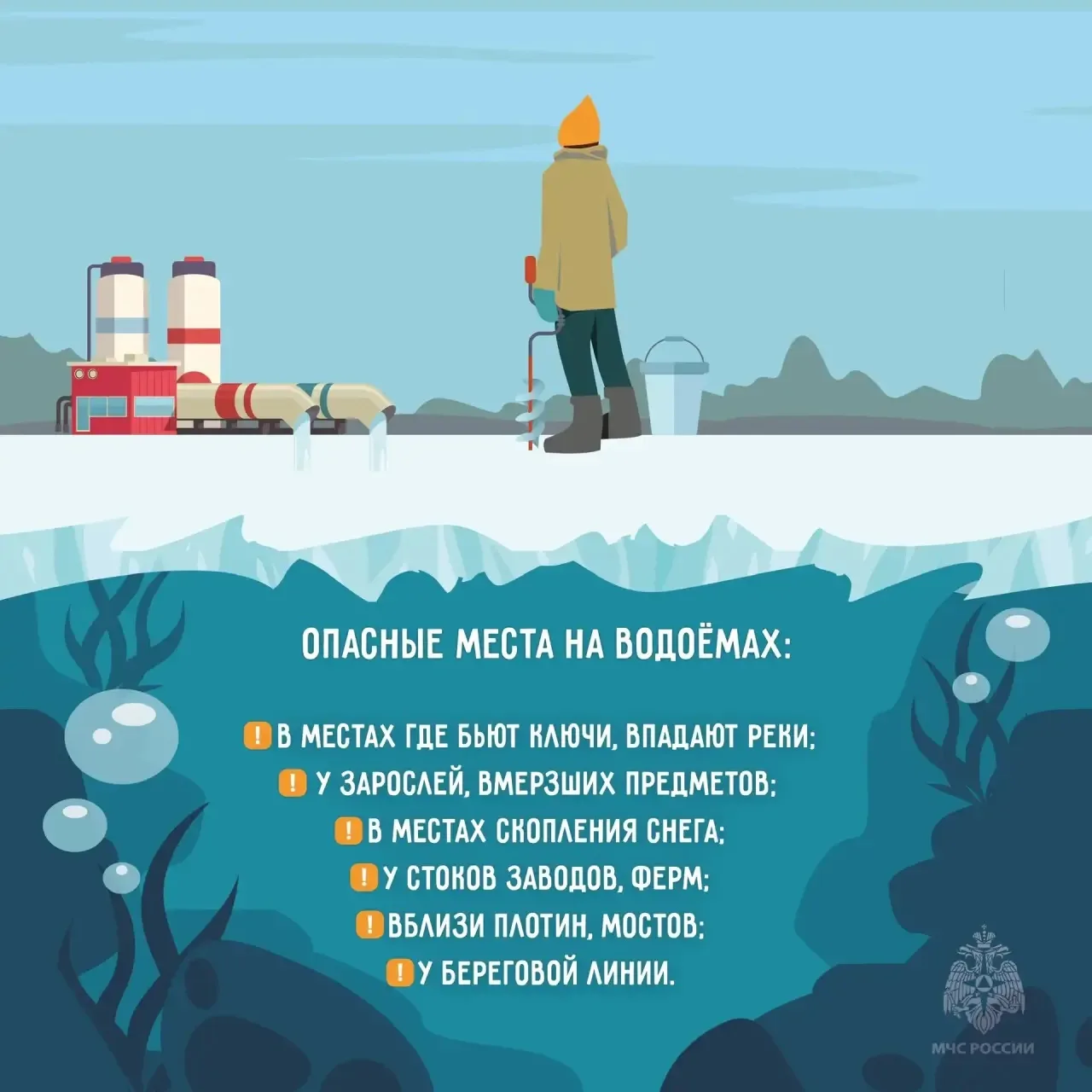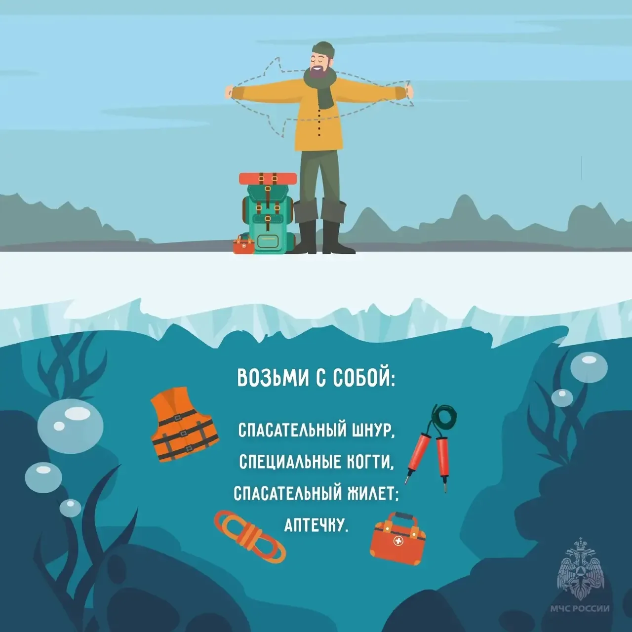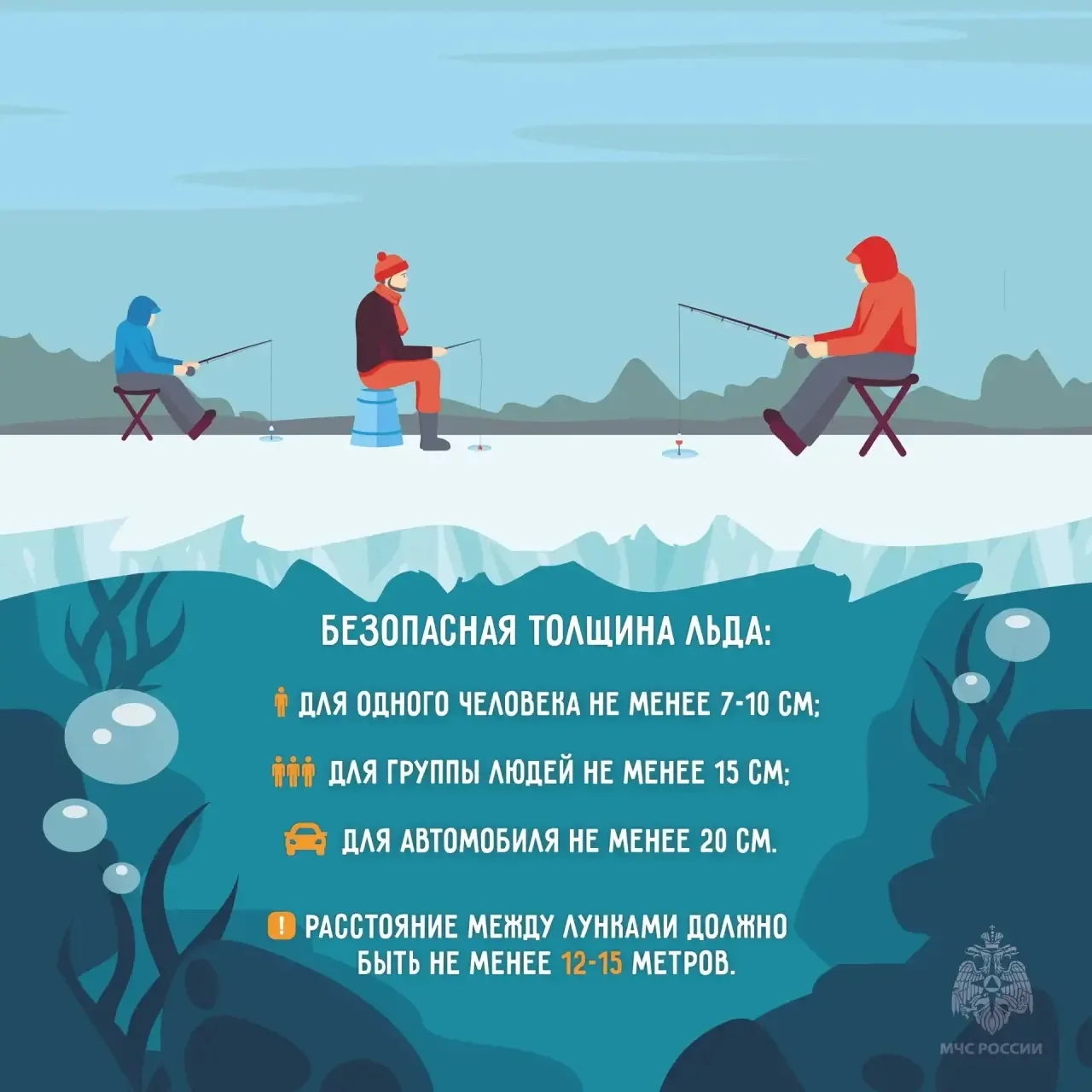 🔸безопасная толщина льда для одного человека — 10 сантиметров, для группы — от 15;