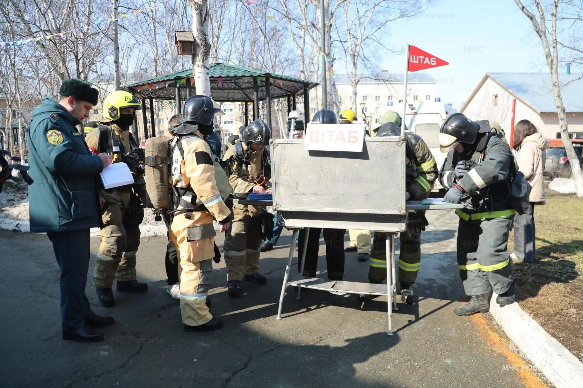 Но на этом тренировка не закончилась. Организаторы в процессе учений озвучили новую вводную: огонь перекинулся на чердачное помещение. На месте также был развёрнут оперативный штаб тушения пожара, представители которого координировали всю работу.