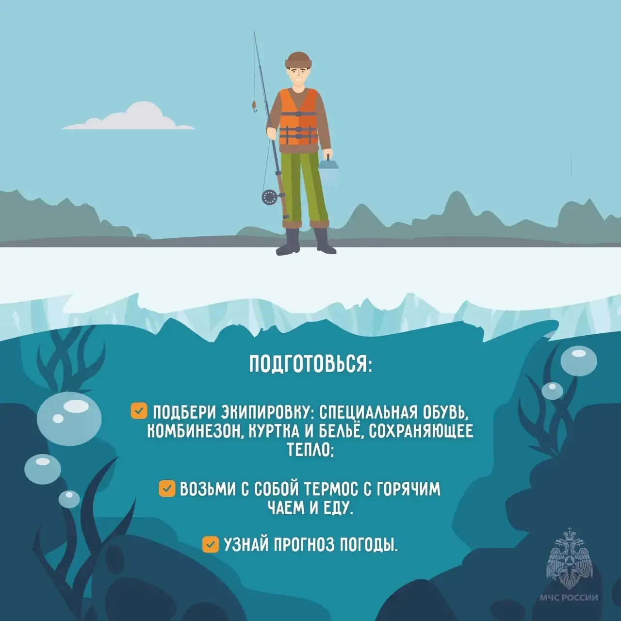 🔸отправляясь за уловом, уточни прогноз погоды, сообщи родным и близким о своём маршруте и времени возвращения;