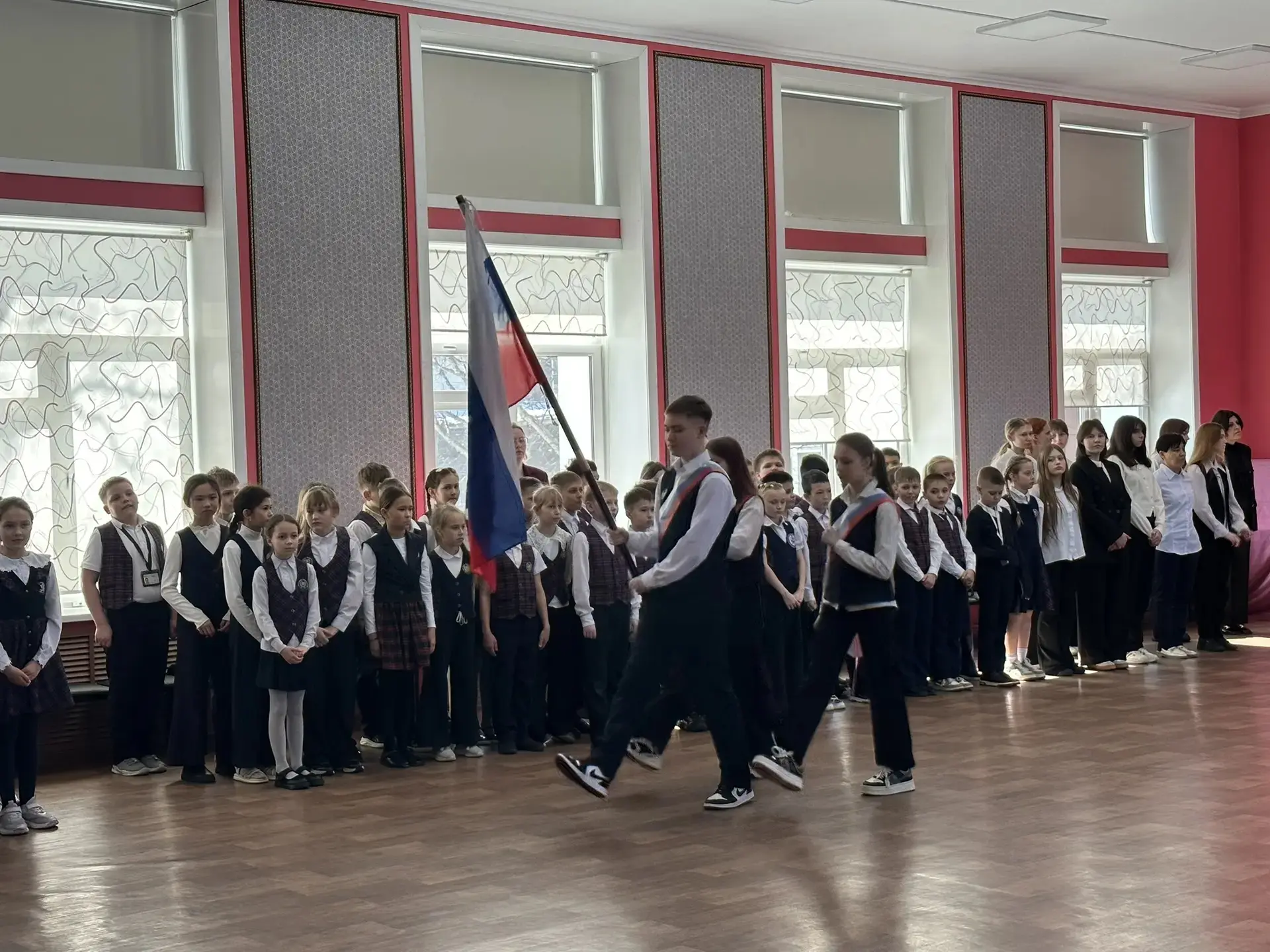 Сегодня начало новой учебной недели и в нашей школе традиционно прошли торжественные линейки в первой и второй сменах с исполнением гимна и выносом флага Российской Федерации.