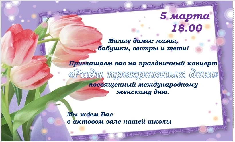 Дорогие наши дамы и любимые педагоги! Приглашаем вас на праздничный концерт, посвященный самым важным женщинам в нашей жизни.