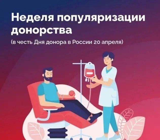 С 13 по 19 апреля — Неделя популяризации донорства крови и костного мозга в России. Она приурочена к Национальному дню донора 20 апреля.Донорство – это добровольное предоставление части крови, её компонентов, а также других тканей или органов для лечебных целей. Наибольшее распространение получило донорство крови и её компонентов.Донорство крови и костного мозга — это акт милосердия и самопожертвования, который может спасти жизнь человека. Благодаря донорам медицинские учреждения могут обеспечить необходимое количество крови и её компонентов для переливания, а также иметь возможность поиска совместимых доноров костного мозга для лечения онкологических и других тяжёлых заболеваний.