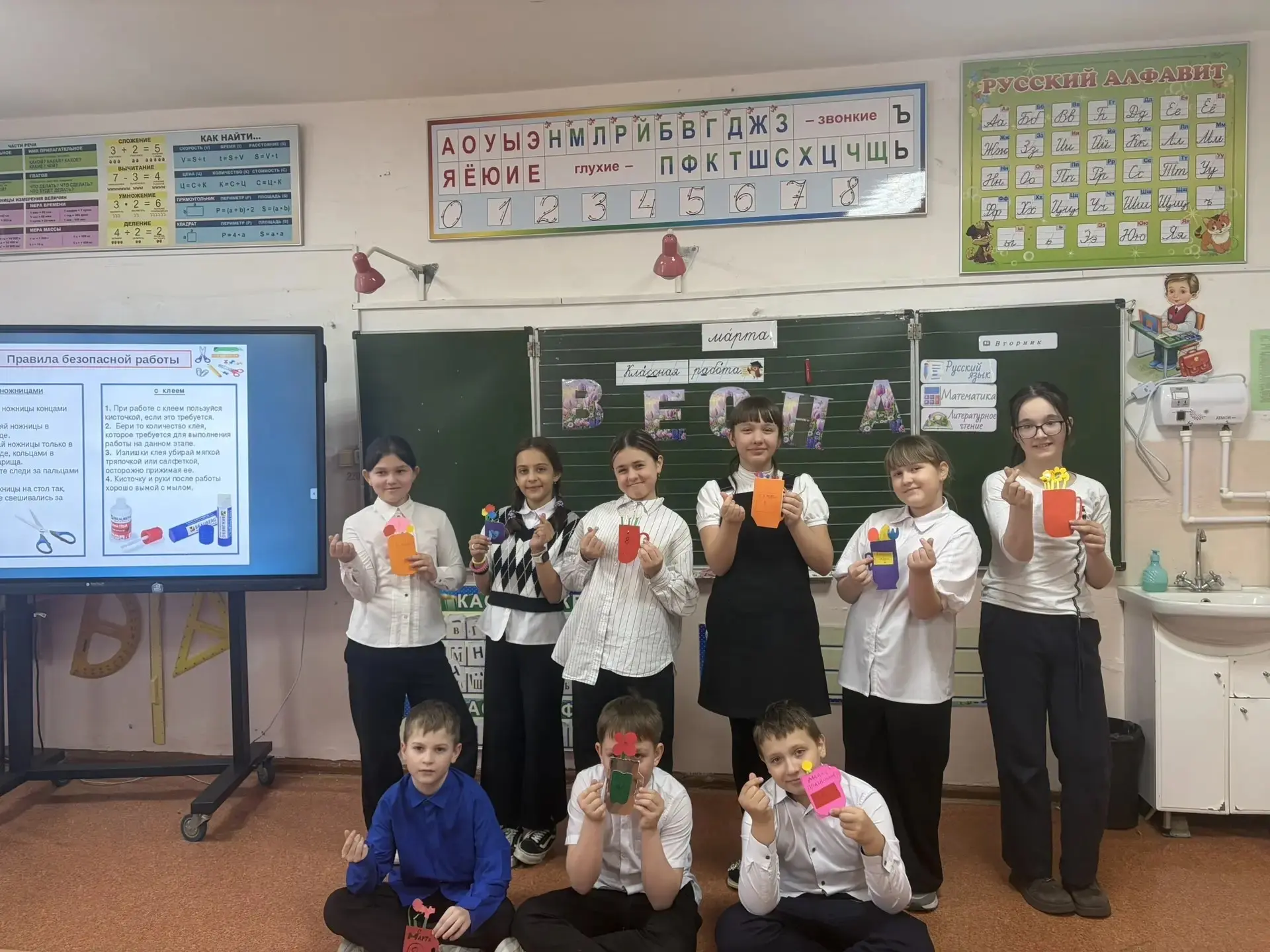 В преддверии праздника, посвящённого Международному женскому дню 🌷, ученики 4 «В» класса вместе с классным руководителем Халеевой А.А. подготовили для своих мам особенные подарки — открытки, сделанные своими руками ✂️🎨💌