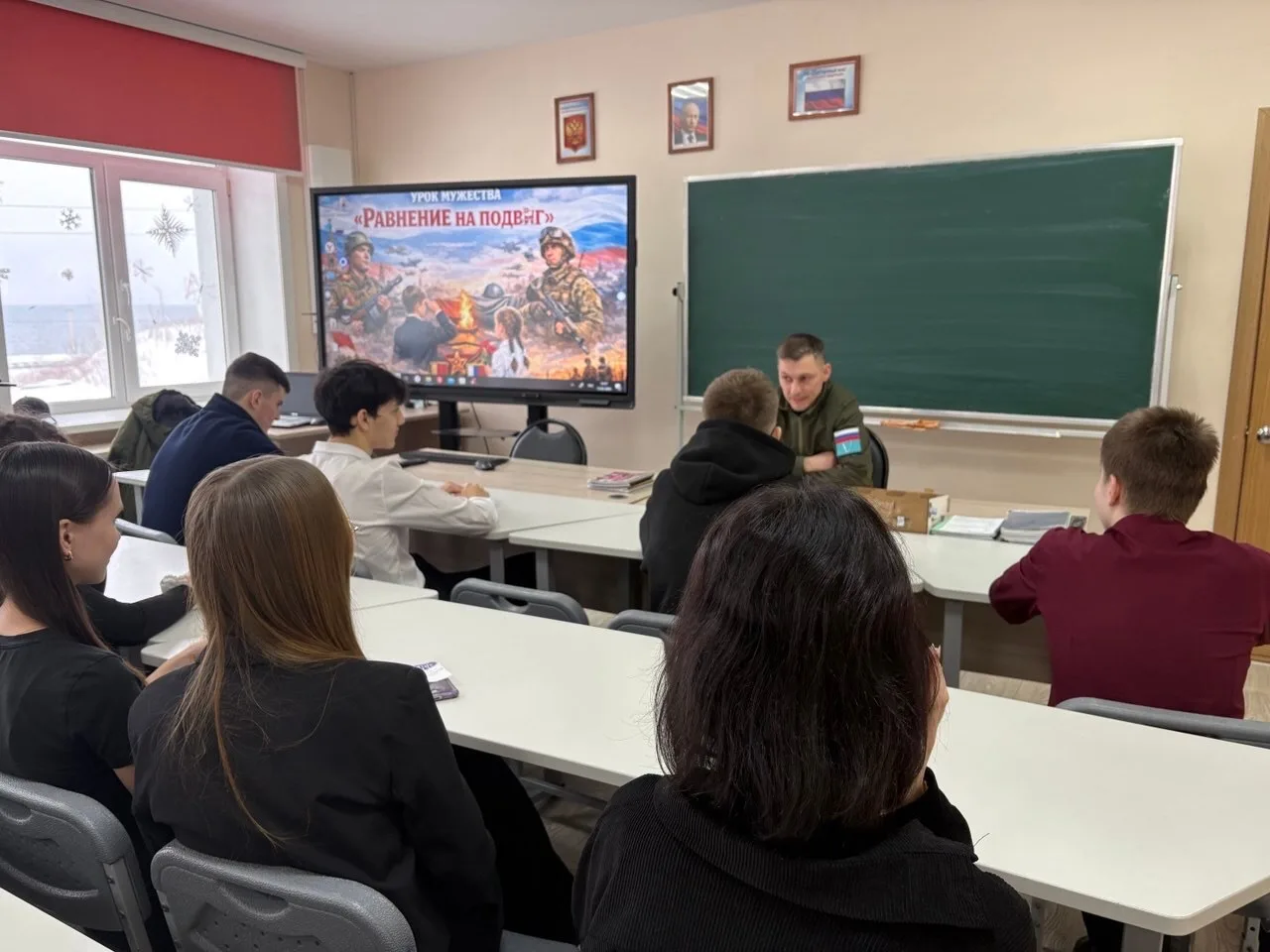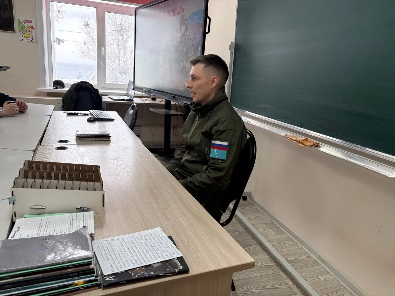 Александр Владимирович рассказал ребятам о своём жизненном пути, службе и боевом опыте, о том, что значит быть защитником Отечества, сохранять стойкость духа, верность присяге и товарищам, а также о важности мира.