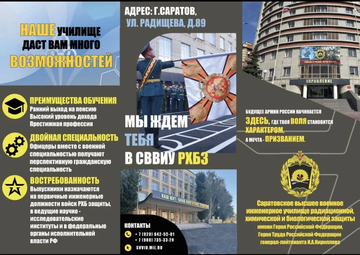 Саратовское высшее военное инженерное училище радиационной, химической и биологической защиты имени И.А. Кириллова приглашает выпускников школ познакомиться с возможностями военного образования!