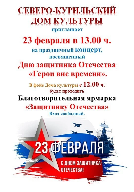 В субботу 21 февраля 2026 года в поликлинике ГБУЗ «Северо-Курильская ЦРБ» в период времени с 10:00 до 12:00 часов будет проведён «День открытых дверей» для проведения профилактических мероприятий Ветеранам боевых действий — участникам специальной военной операции и членам их семей. Ветераны боевых действий — участники специальной военной операции и члены их семей смогут пройти обследование в рамках первого этапа диспансеризации с привлечением дополнительных специалистов (врач-хирург, акушерка, врач-педиатр) и проведением необходимых методов обследования.